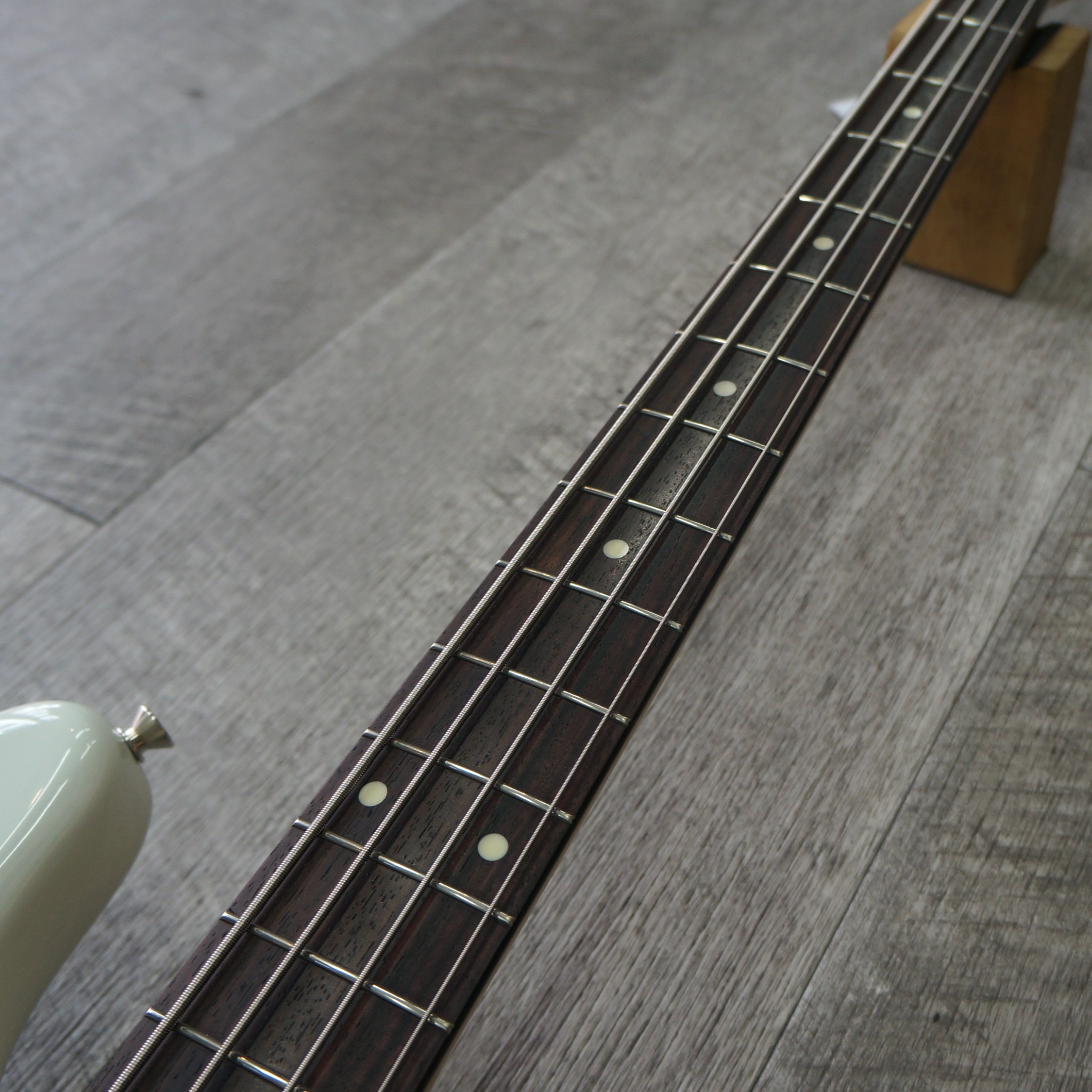 オリンピックホワイトカラーにべっ甲柄のピックガードを合わせたジャズベース。