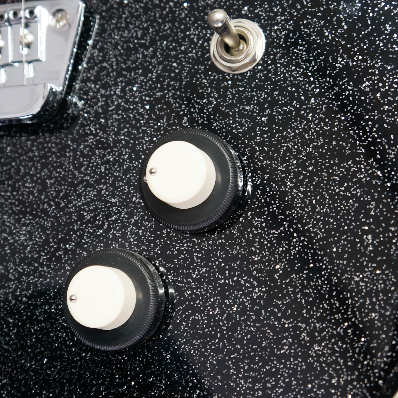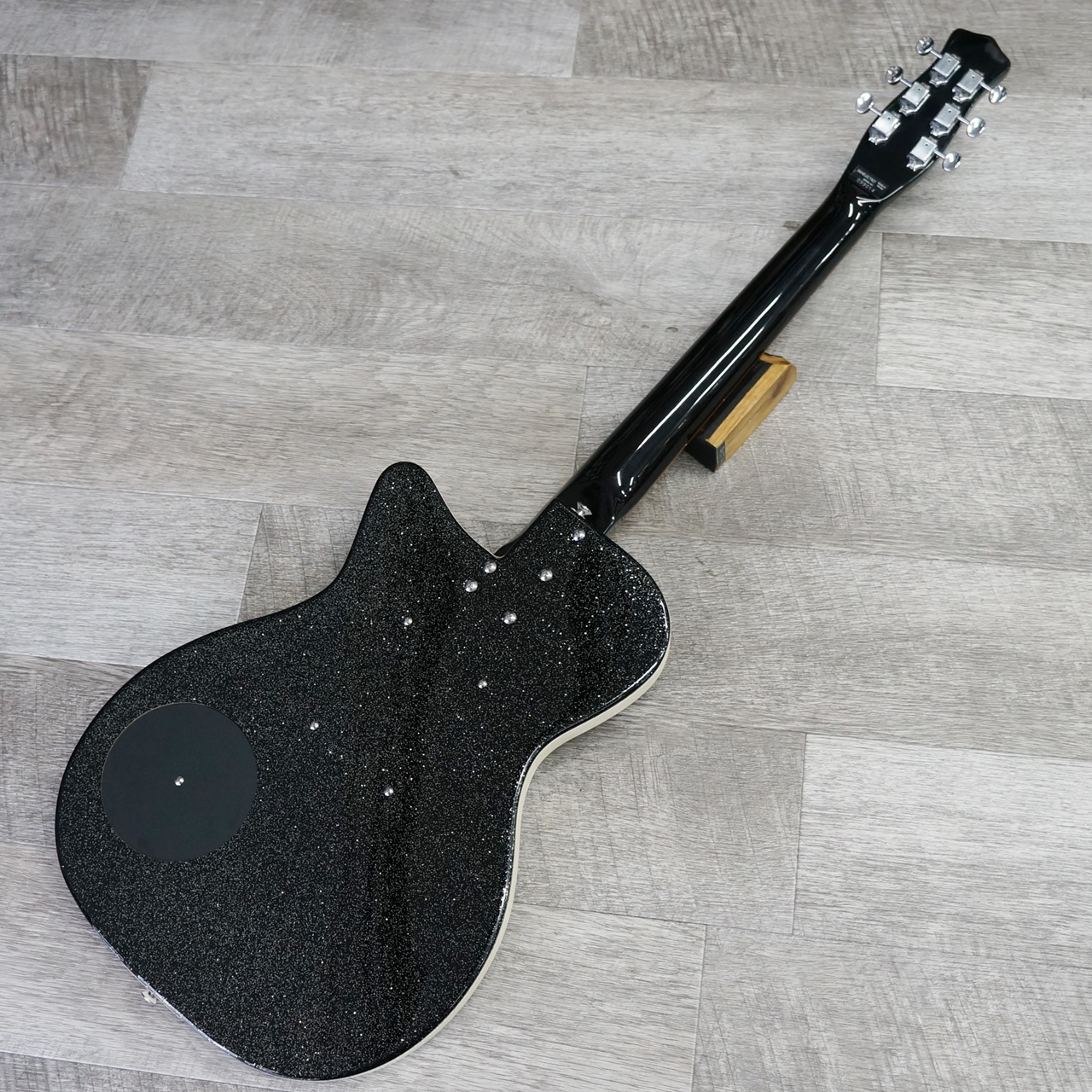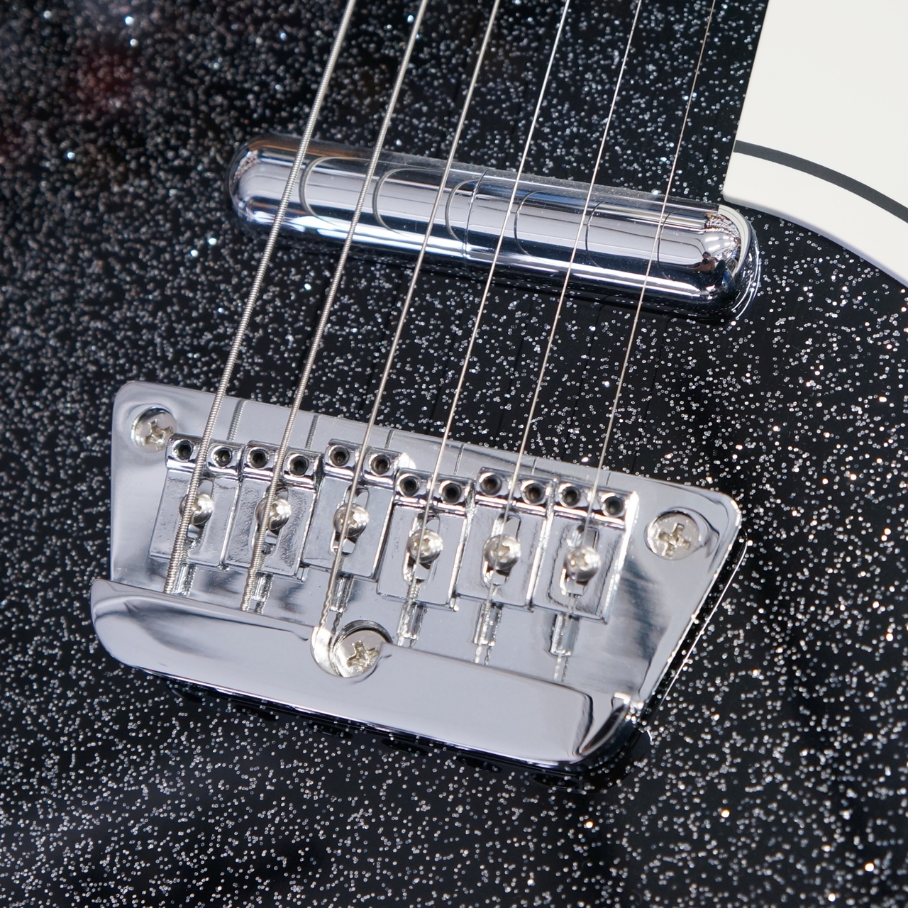 ボディカラーはブラック・メタルフレークとなり、ピックガードはホワイト、ブリッジはローズウッドサドルではなくアジャスタブルタイプとなります。ネック裏は黒となります。