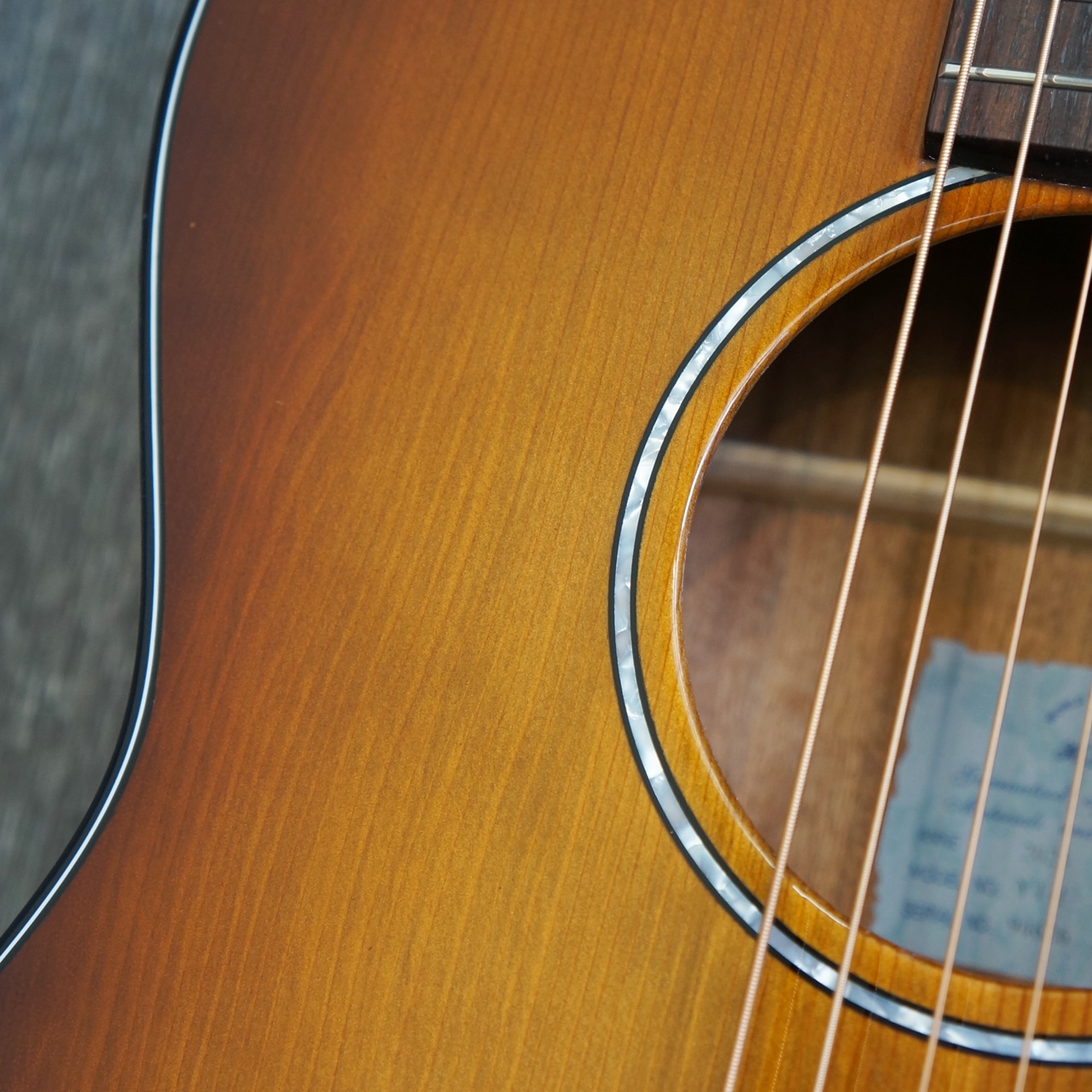 深みのあるボディカラーに、シングルラインのサウンドホール・ロゼッタが映えます。