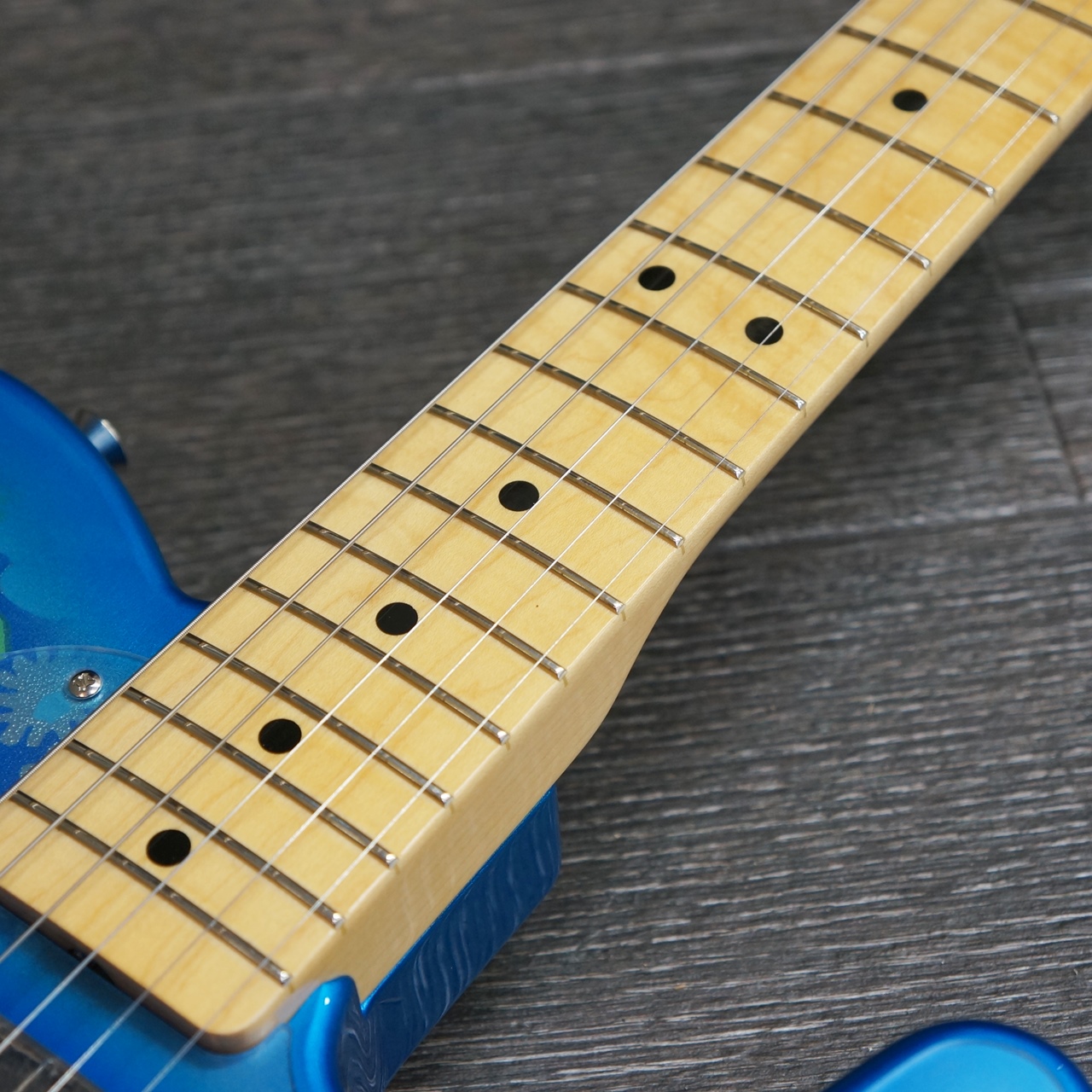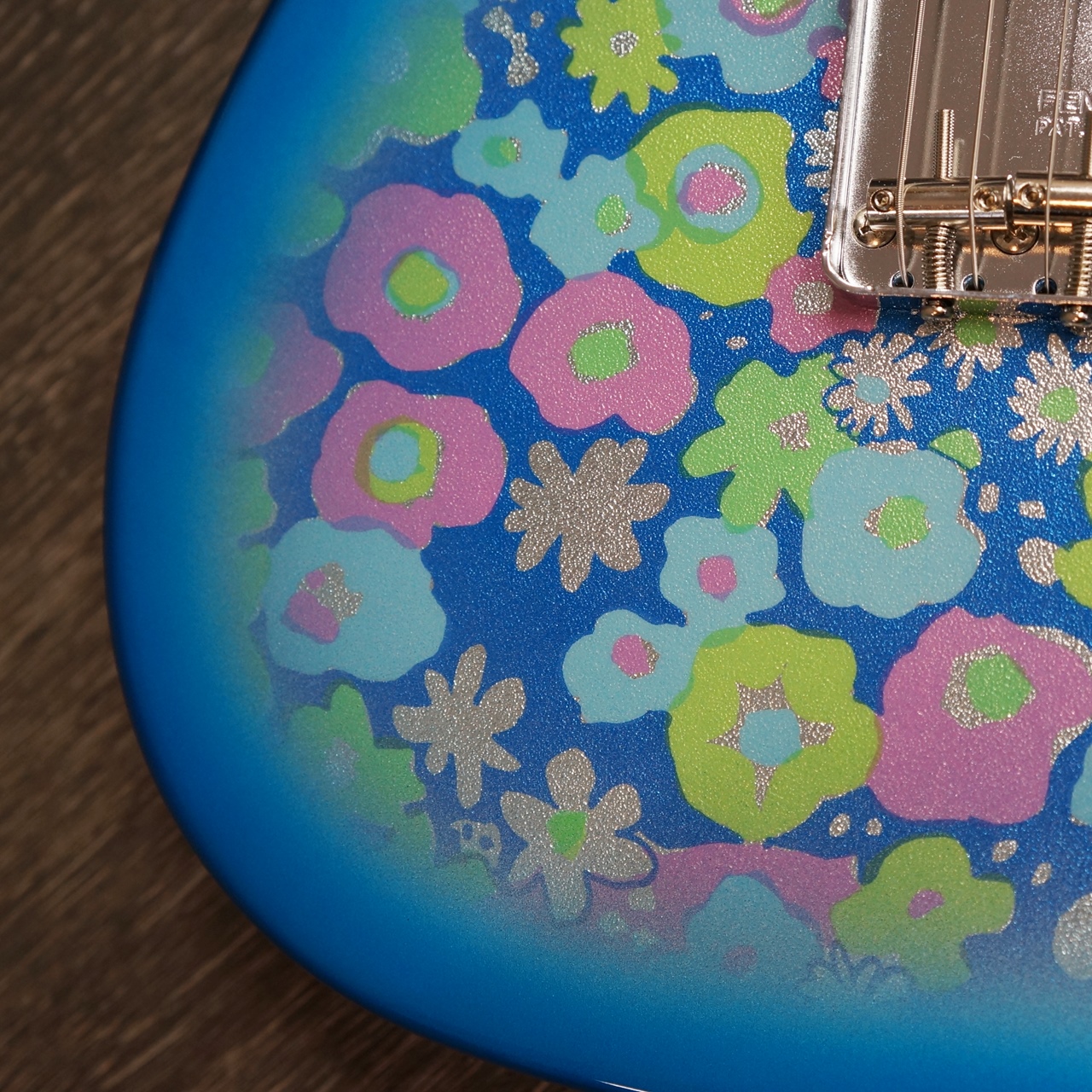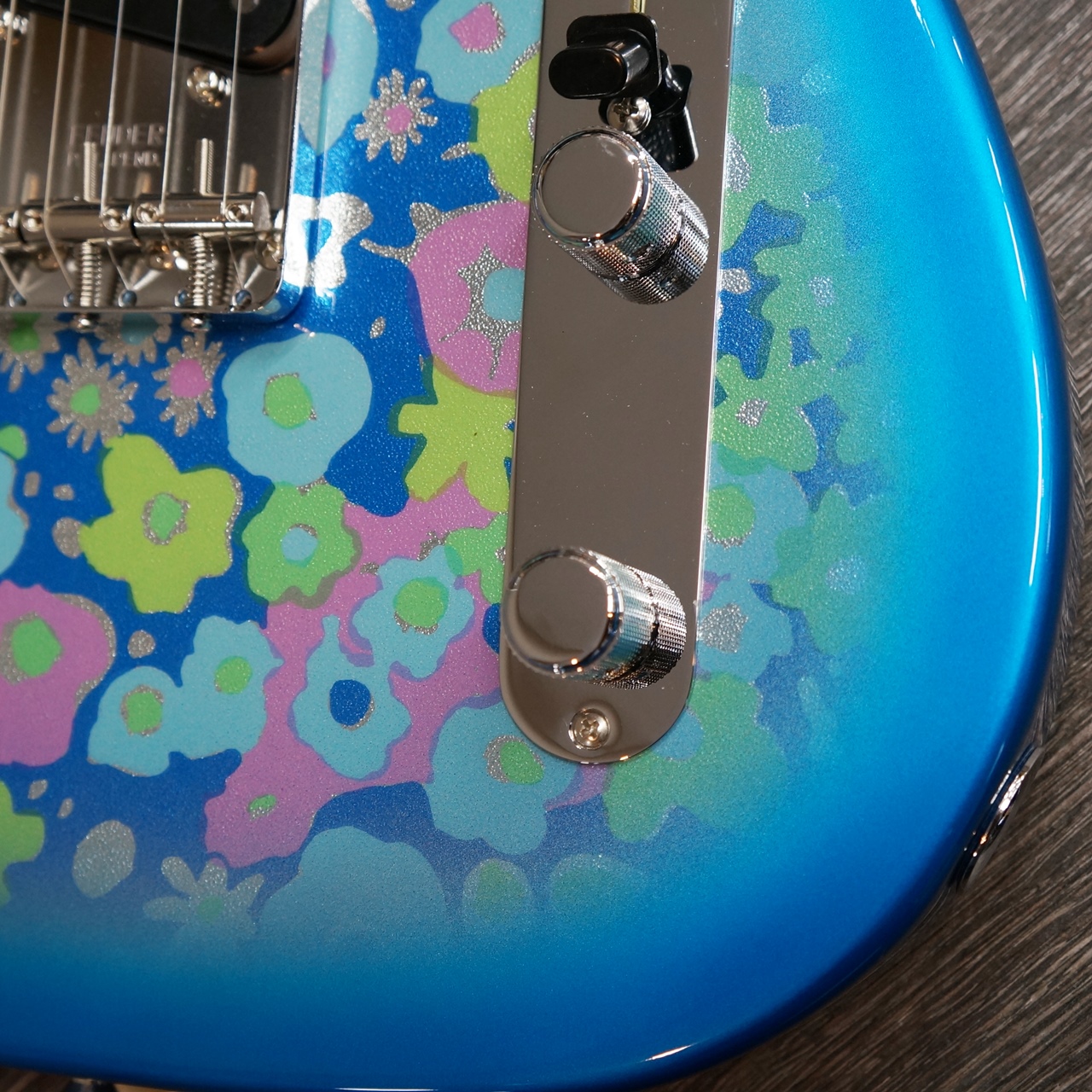 Made in Japan Limited Telecaster® Blue Flowerは、Blue Flowerのシートを貼り付けた、グロスフィニッシュのアルダーボディを採用。