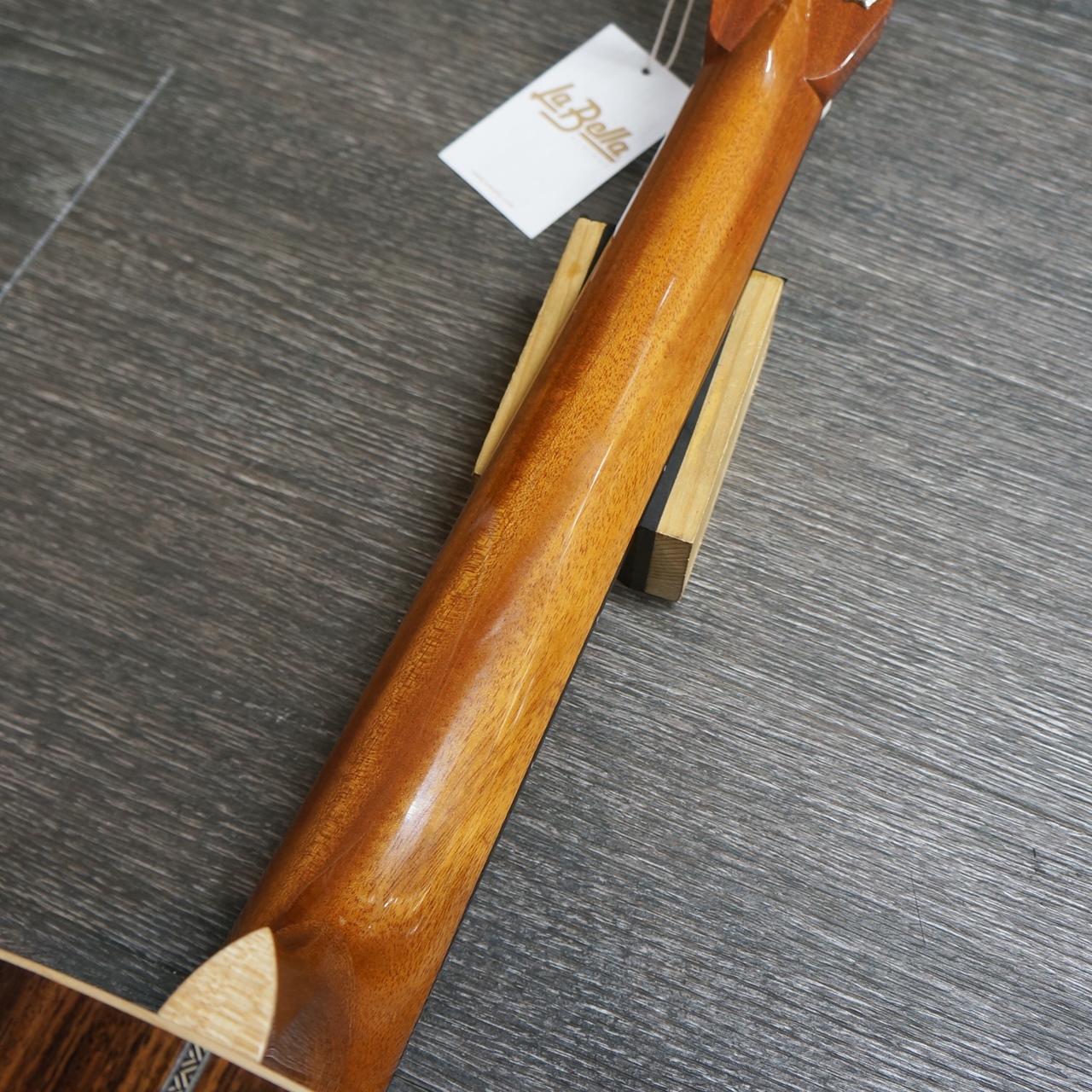 ペグは国産Gotohを搭載。ボリュートによるマホガニーネック、美しいトーチインレイなどが特徴です。