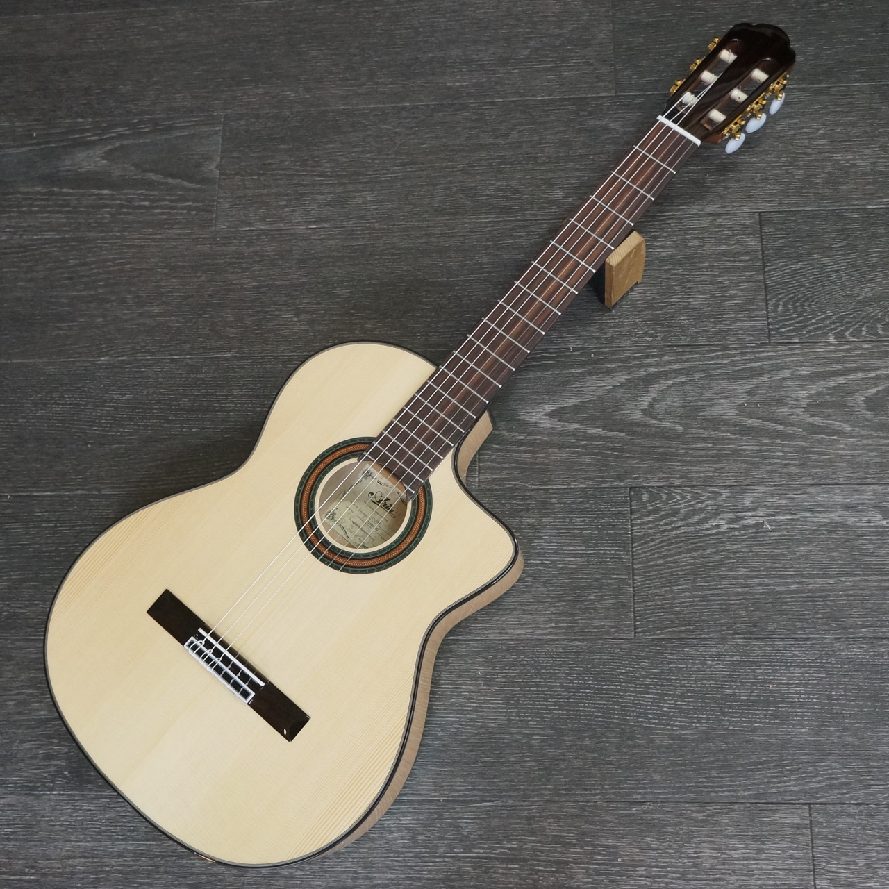 トップに単板スプルース、バックとサイドにフレイムドメイプルを採用したカッタウェイエレクトリックモデル。