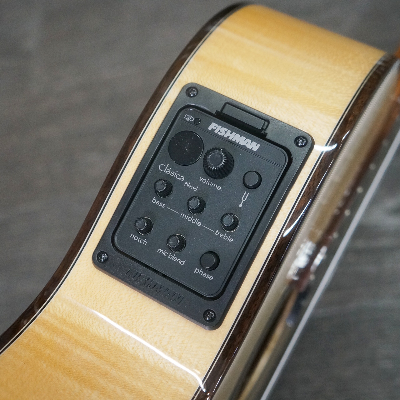 プリアンプには、フィッシュマンのチューナー機能搭載プリアンプ「Clasica Blend」を採用。
