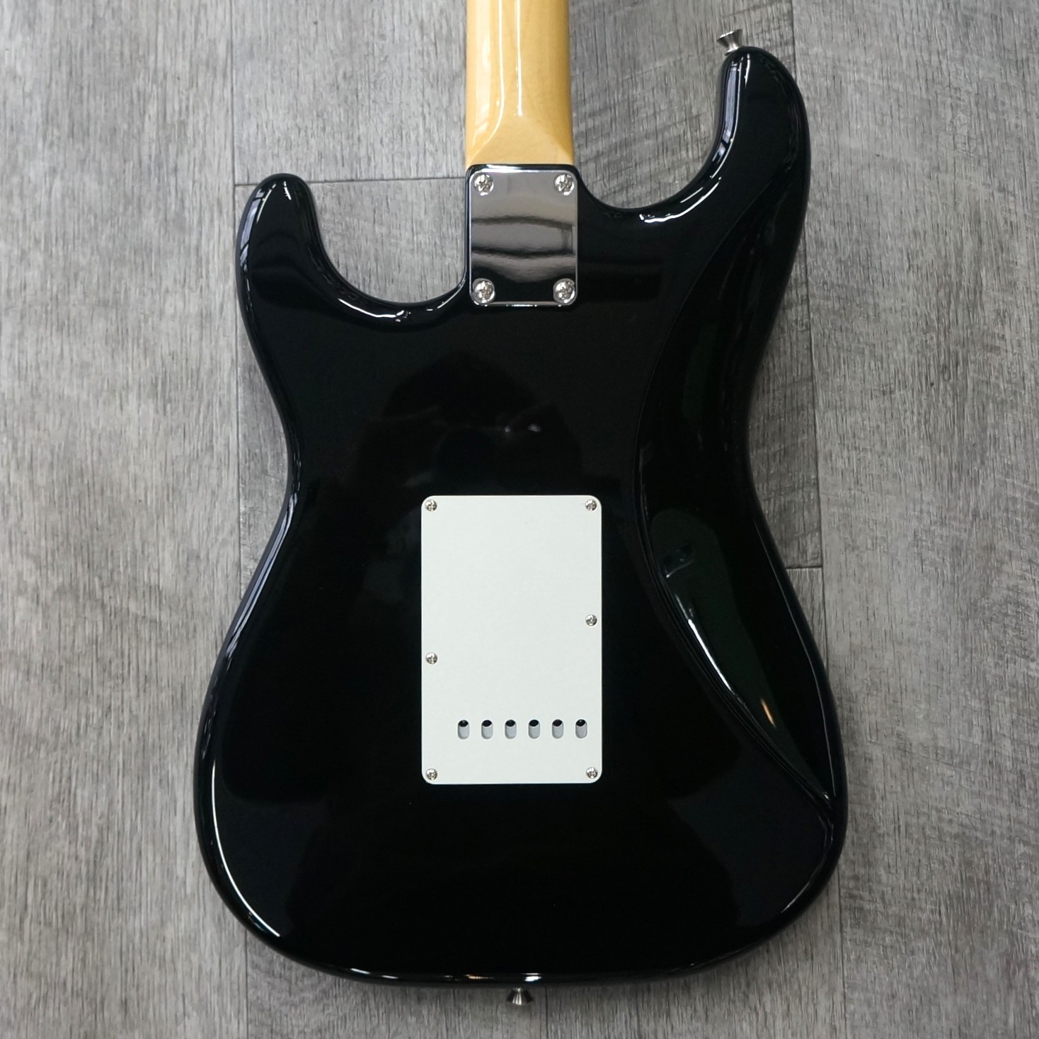 ブラックカラーのストラトキャスターです。こちらの重さは約3.4kgほどとなります。