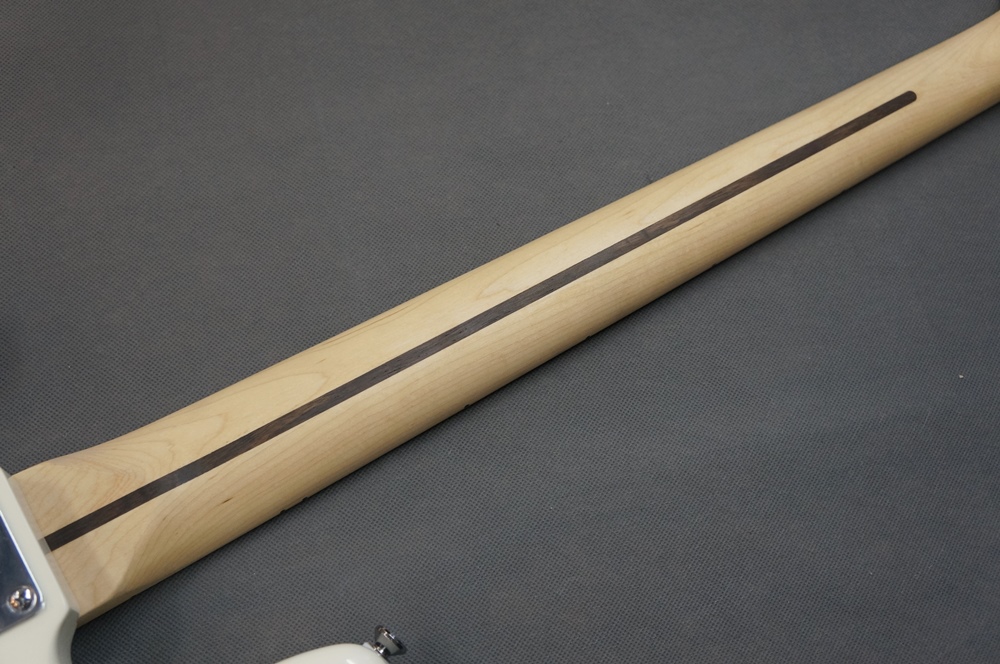 ボディにポプラ材を使用。白いボディに黒いピックガードを搭載したプレシジョンベースです。