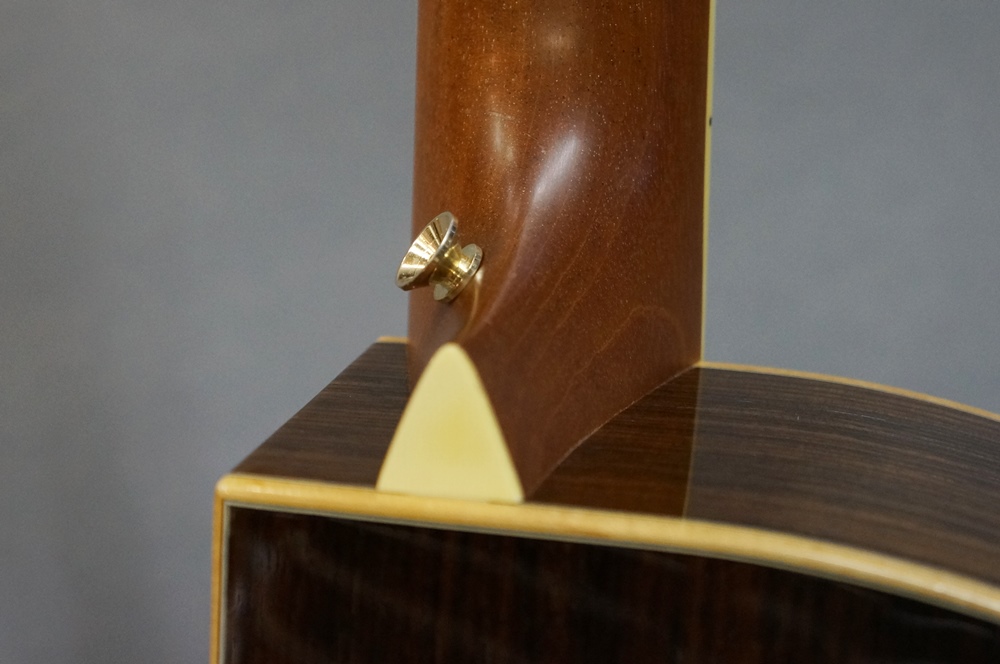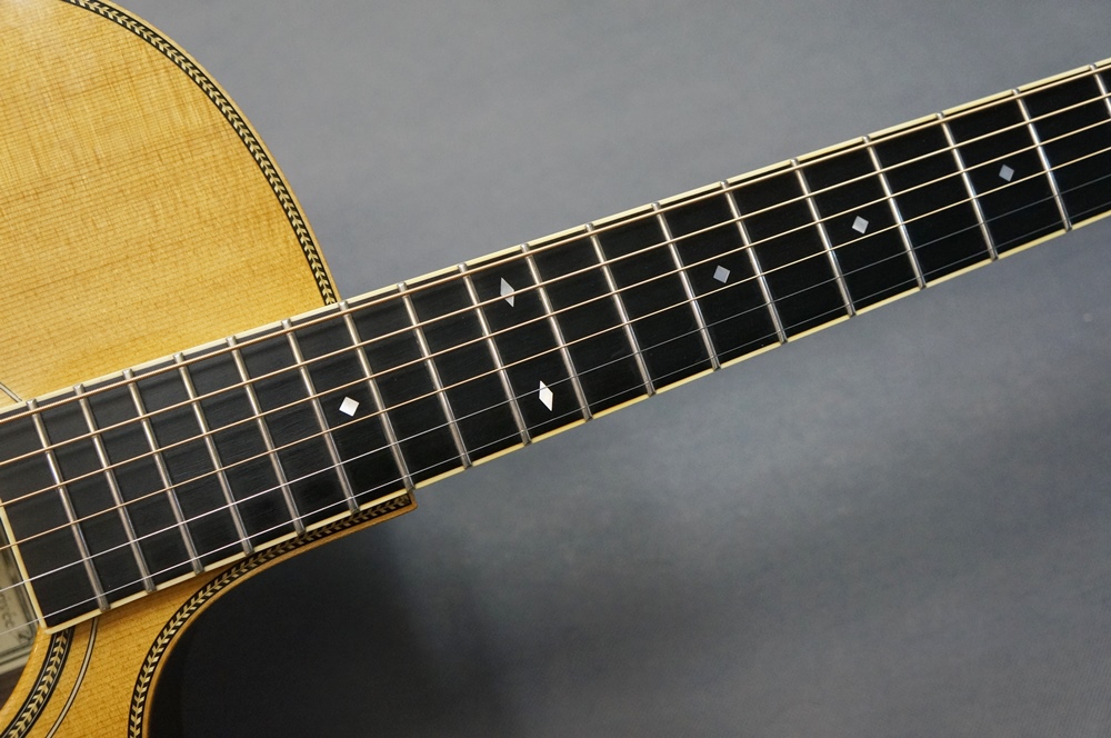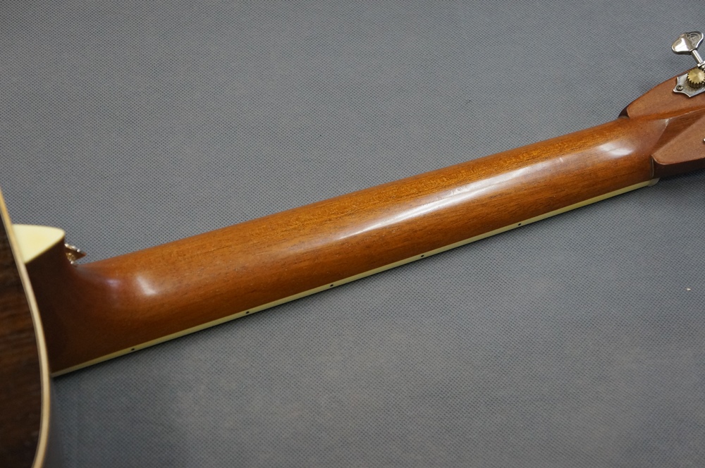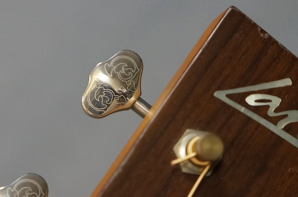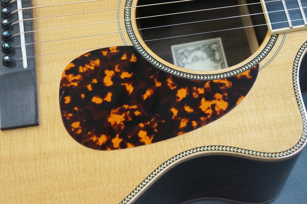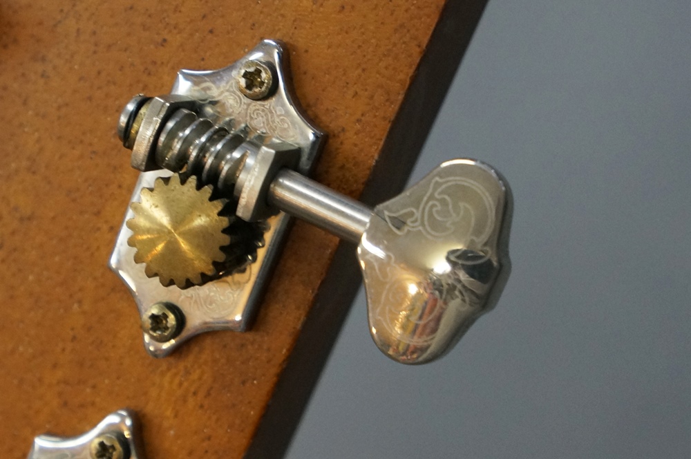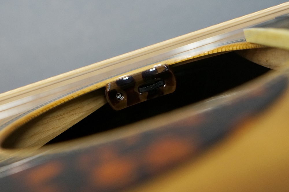 サウンドホールの装飾や、メイプルを使ったヘリンボーンバインディング、ペグ周りのデザインなど、細かい装飾にも拘りが見られます。