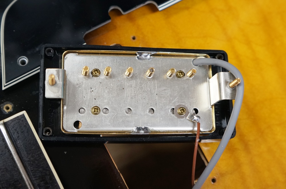 ペグはゴトーのロック式に交換。ピックアップはギブソンのゴールドカバードのタイプに交換されております。