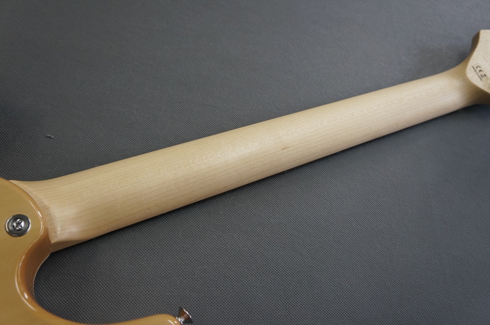 トップにフレイムメイプル材、バックにポプラを使用。ボディ形状はSTタイプとなります。