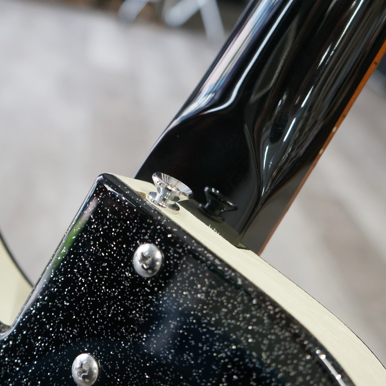 ボディカラーはブラック・メタルフレークとなり、ピックガードはホワイト、ブリッジはローズウッドサドルではなくアジャスタブルタイプとなります。ネック裏は黒となります。