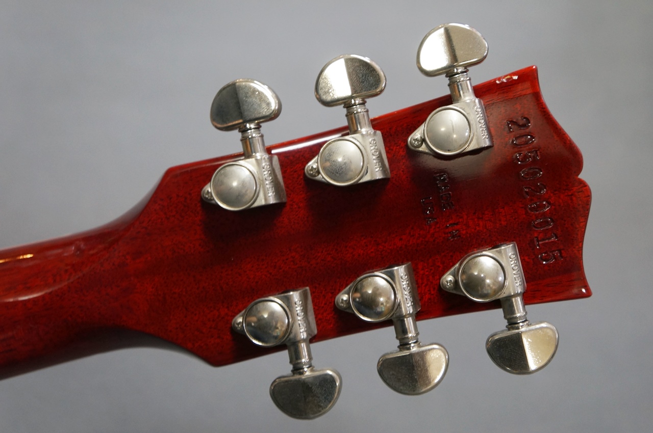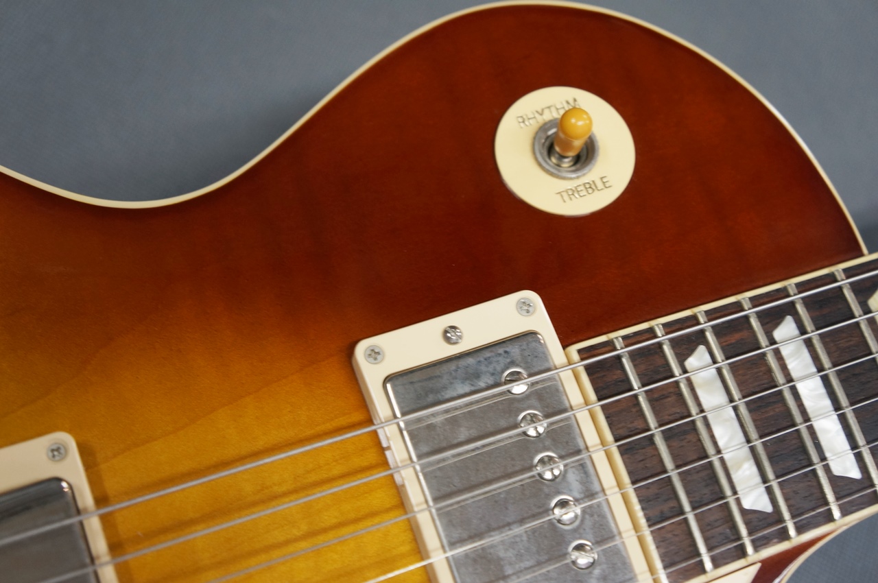 レスポール・スタンダード60’は、ソリッド・マホガニー・ボディにAAフィガード・メイプル・トップ、スリム・テイパーによる60年代スタイルのマホガニー・ネックにローズウッド指板とディッシュ・インレイを擁し、ABR-1・チューン・オー・マチック・ブリッジ、アルミニューム・ストップバー・テイルピース、グローヴァー・ロトマチック・キドニー・チューナー、ゴールド・トップハット・ノブが搭載されています。