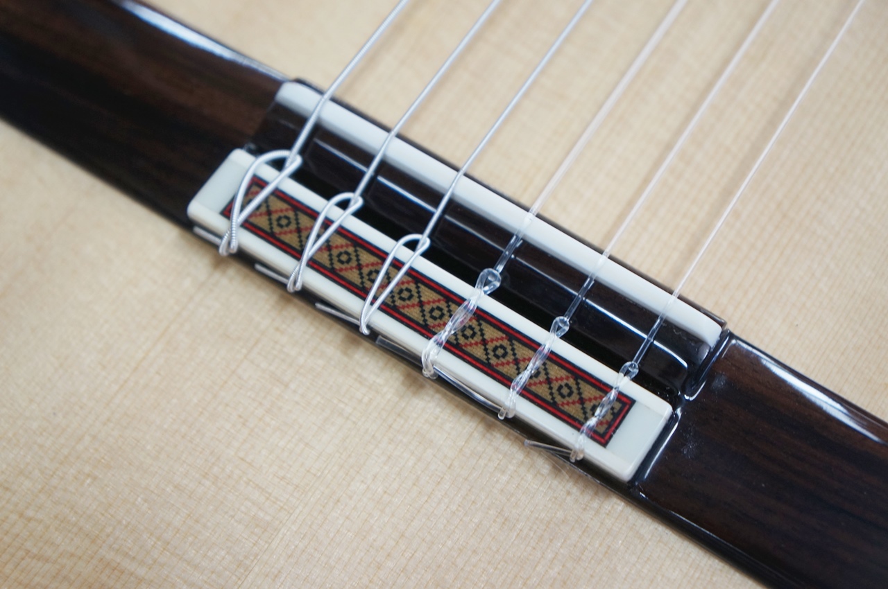 ブリッジの弦留めは、少し暗めのベージュ地に、内側に黒丸を持つ菱形が並んだ模様です。