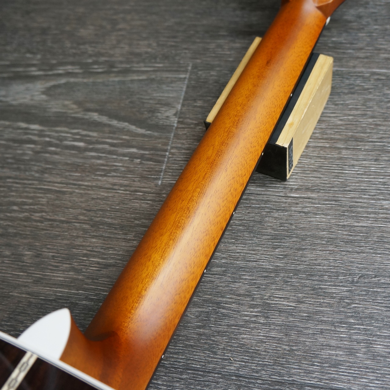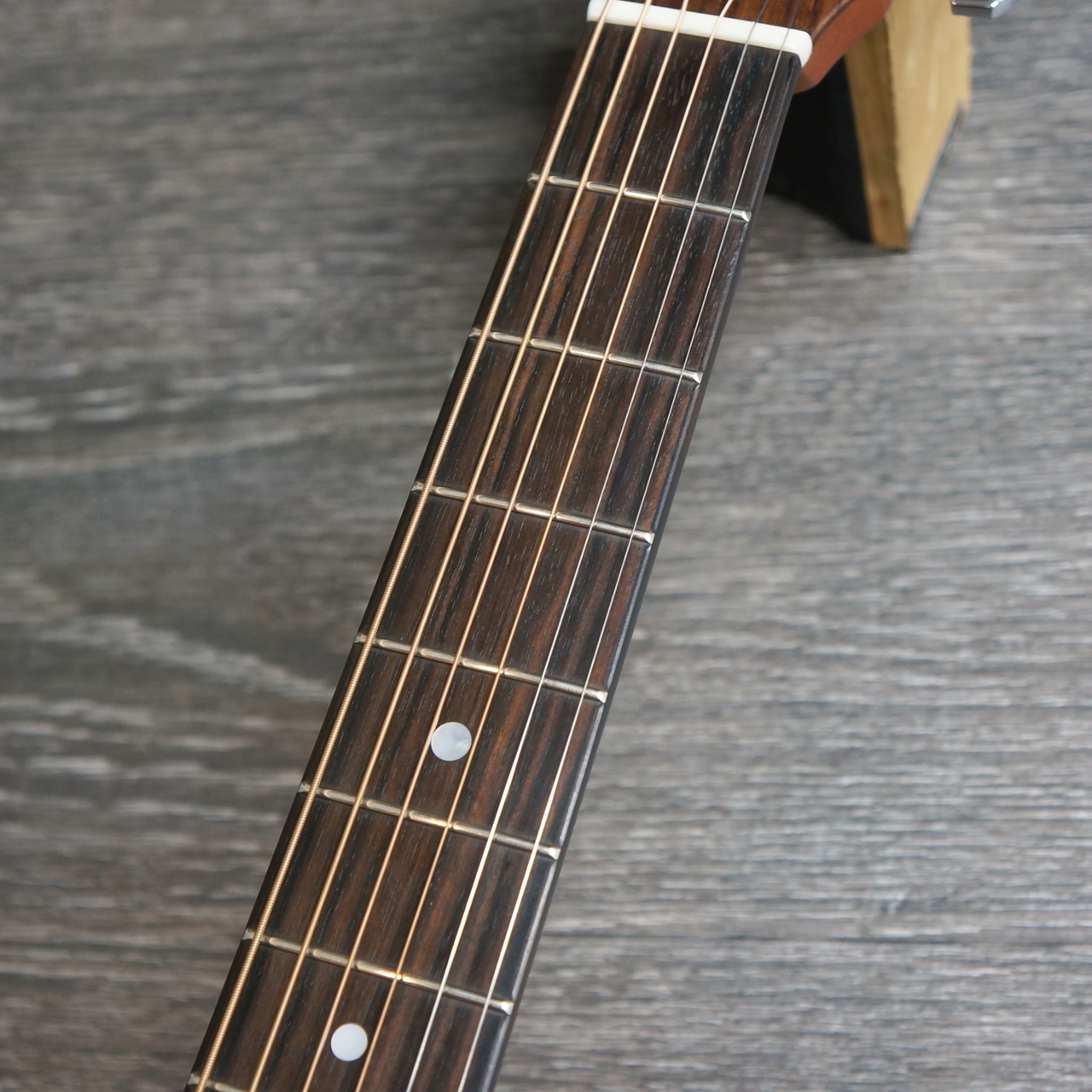 ボディトップに単板スプルース、サイドとバックに単板ローズウッドを使用。スケールは645mm、ナット幅は42mmによる国産のドレットノートスタイルです。