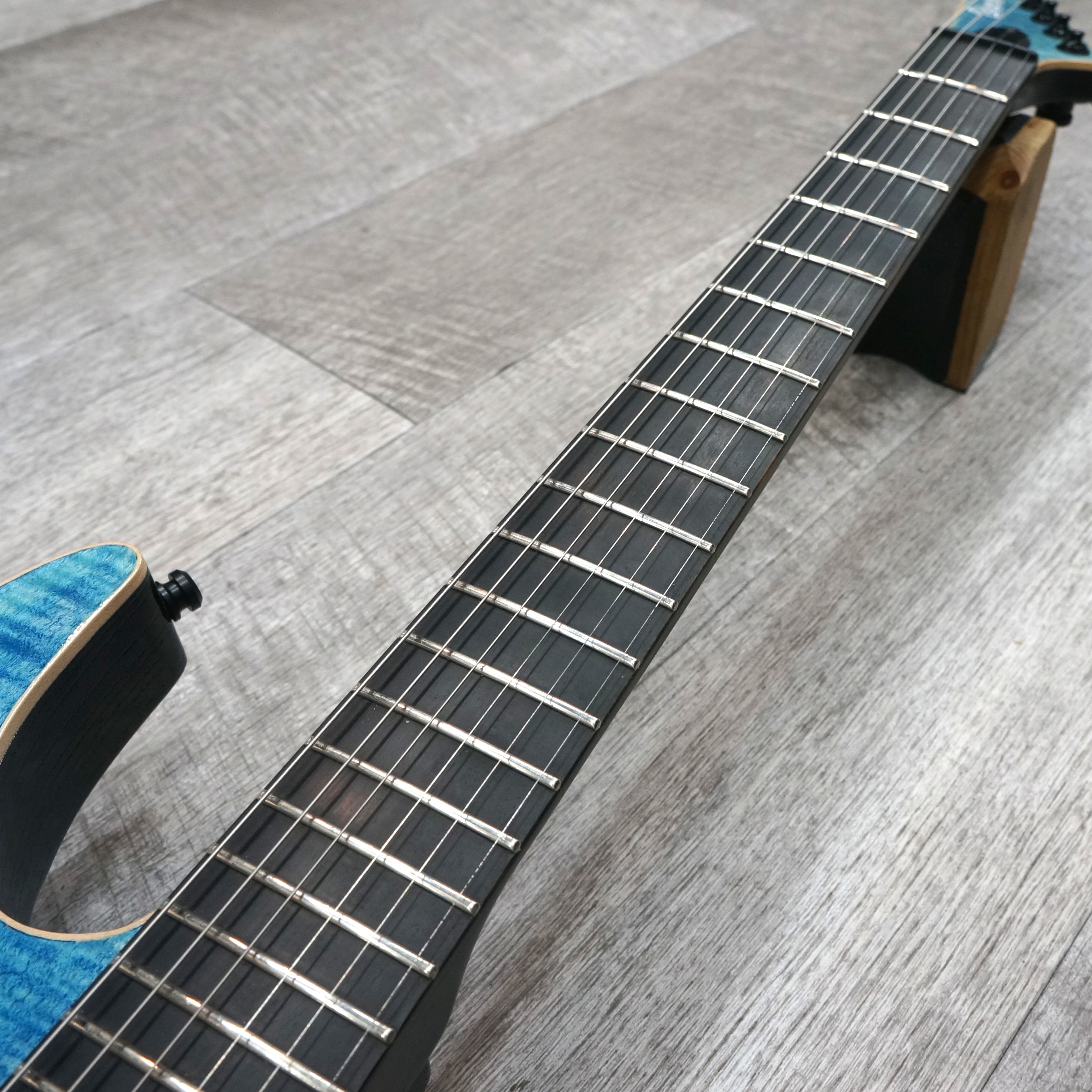 指板トップのポジションマークは敢えて入れず、スタイリッシュなルックスに仕上げてあります。