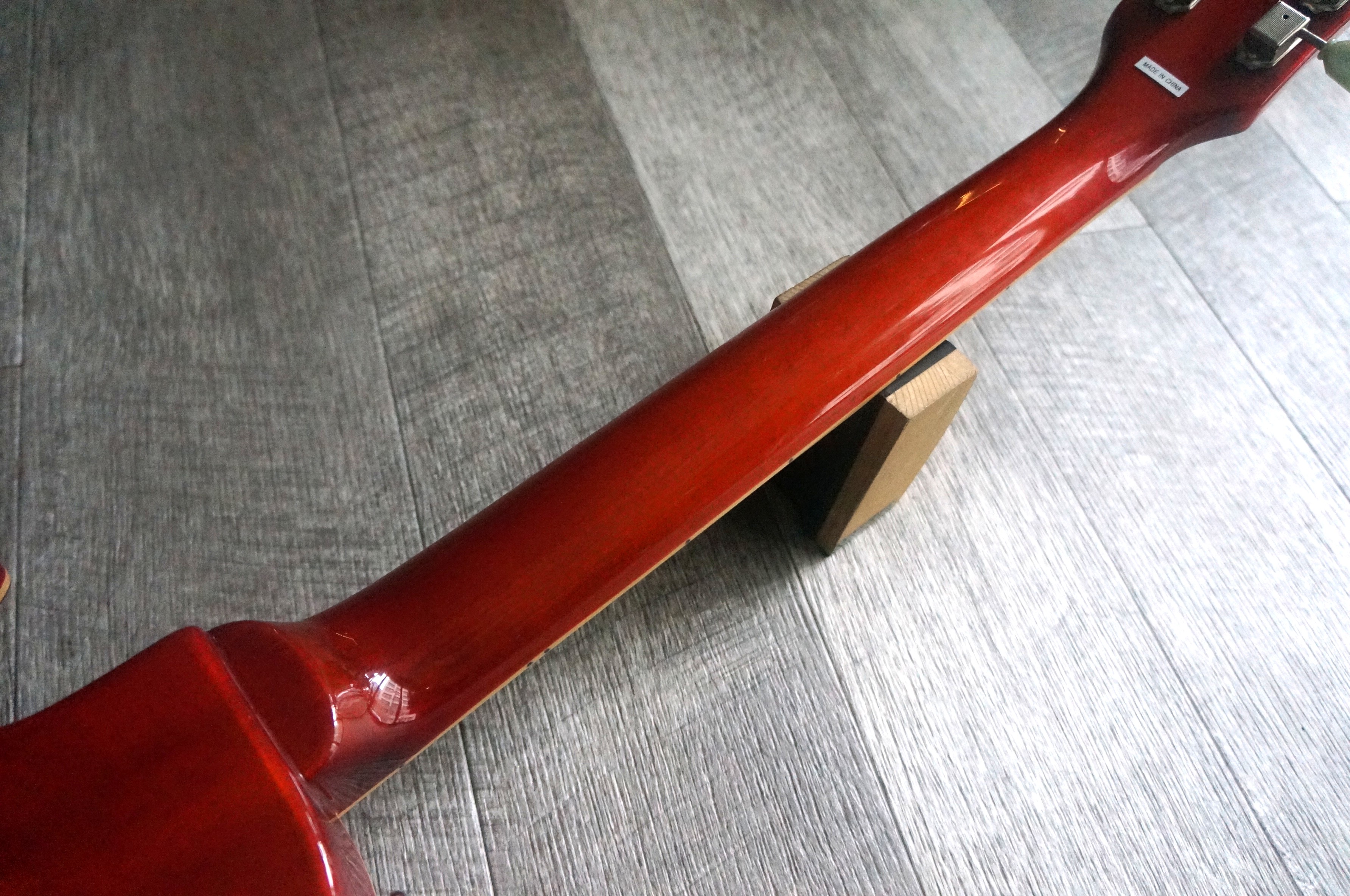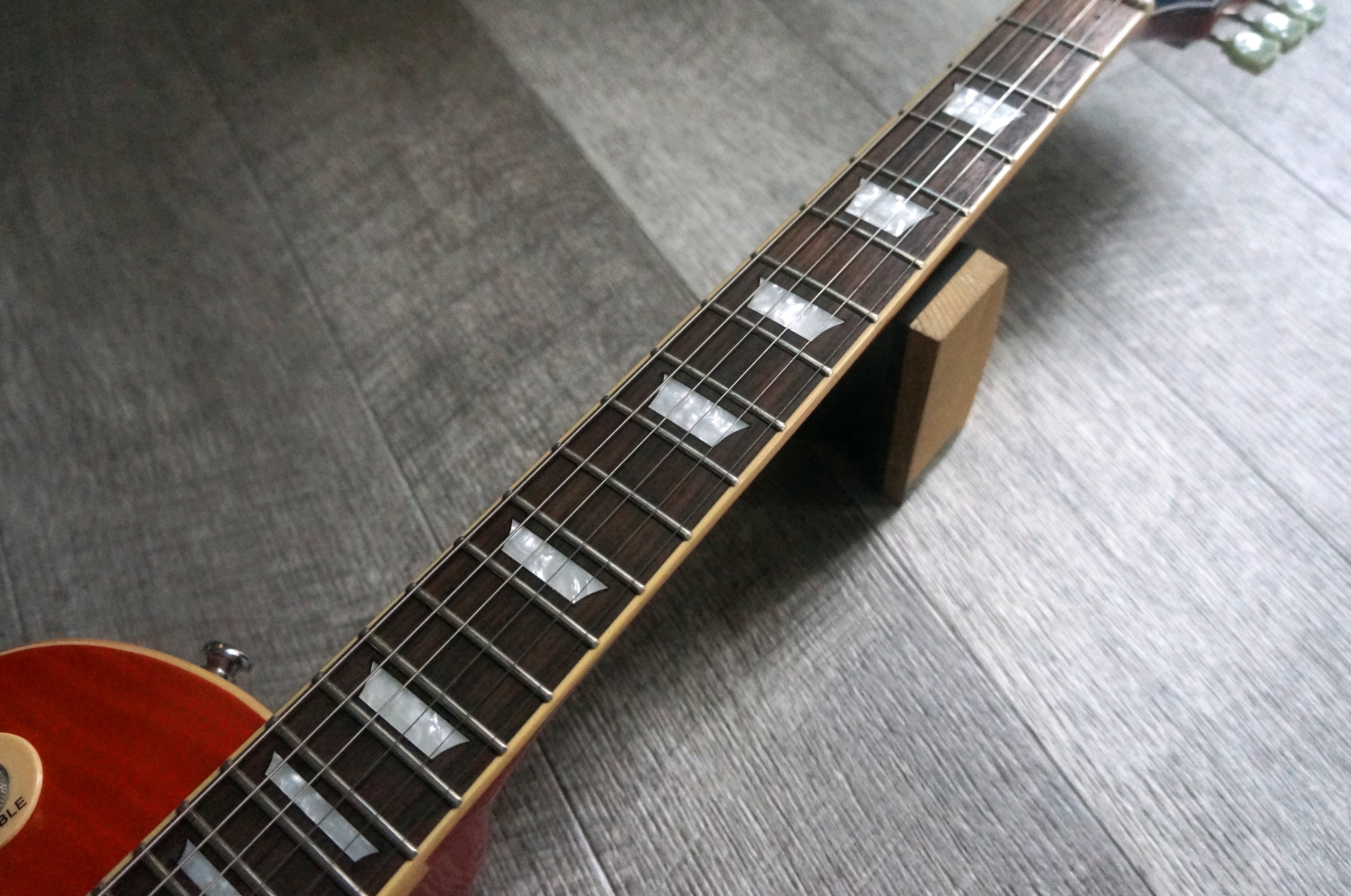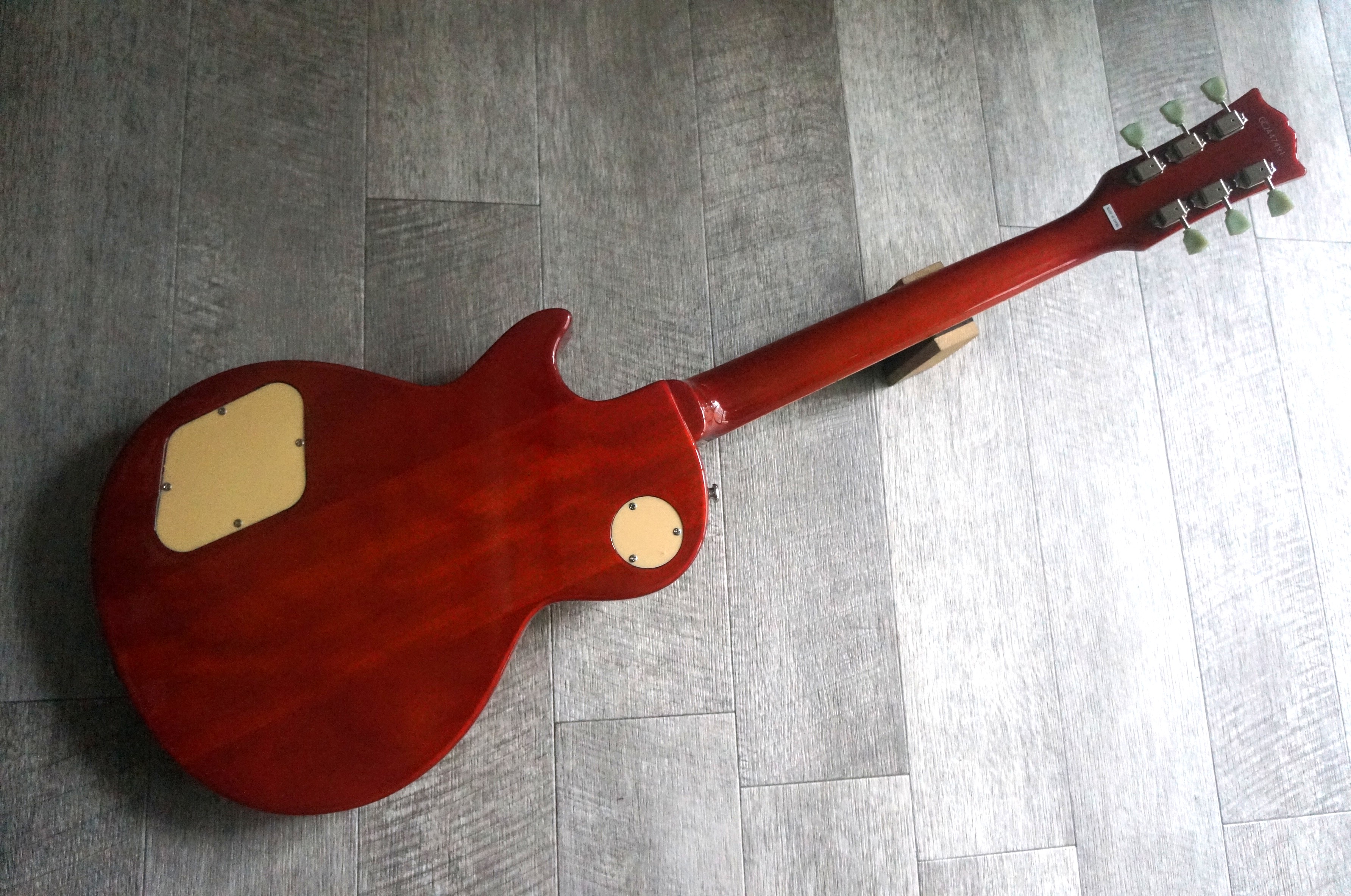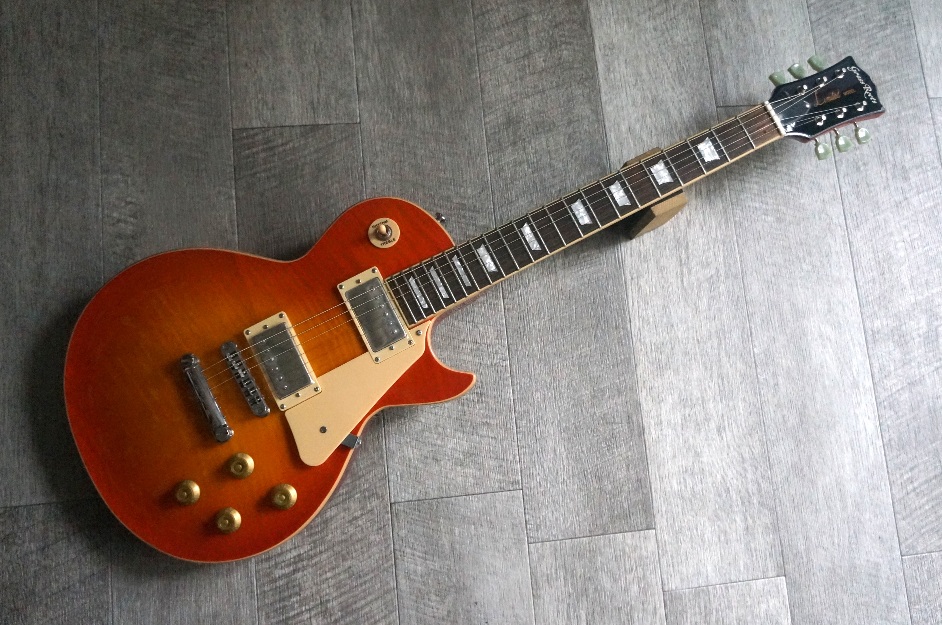 トップにフレイムメイプル材を使用し、バックにオクメ材を使用したハニーサンバーストカラーのレスポールスタンダードタイプ。