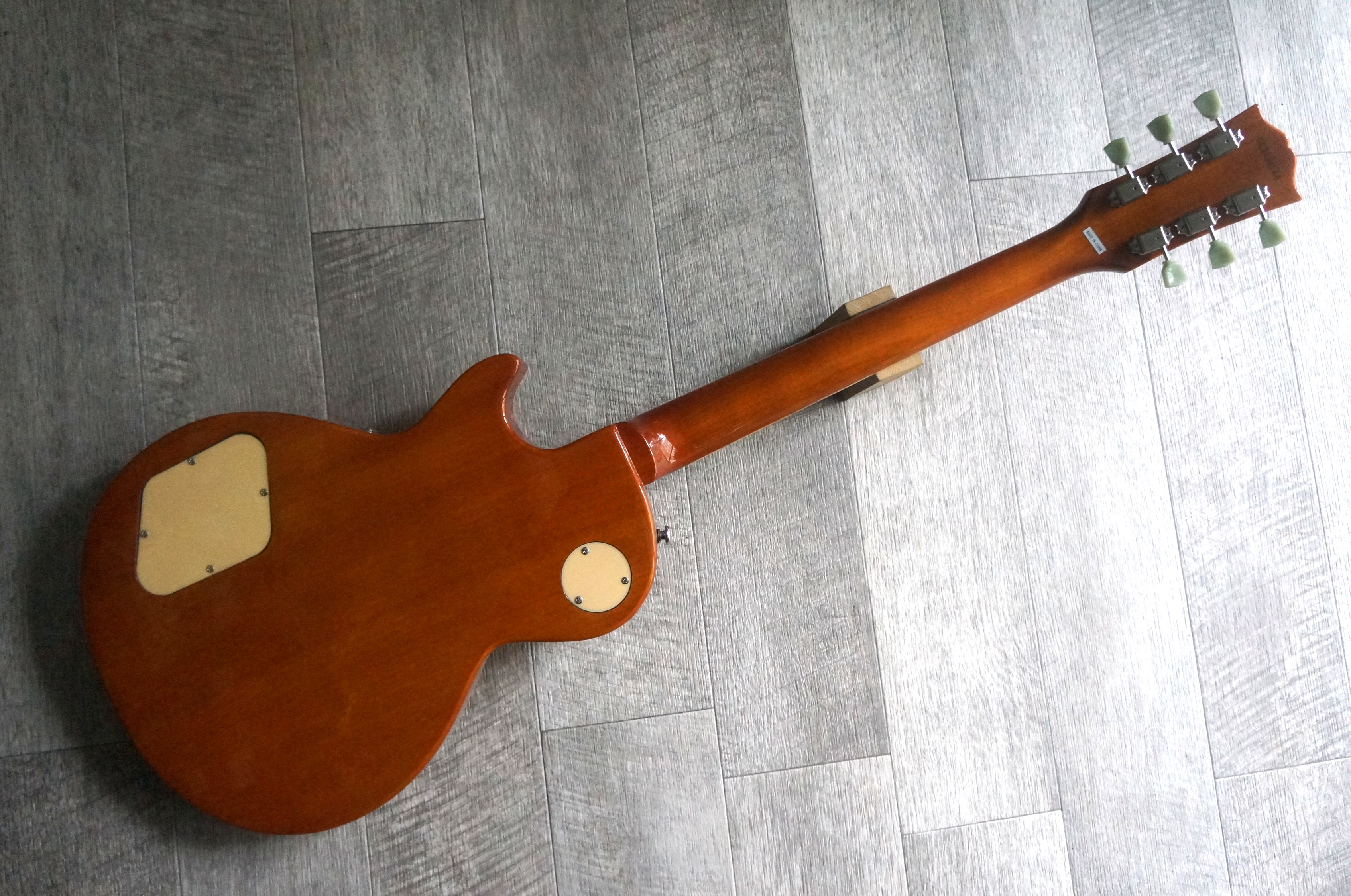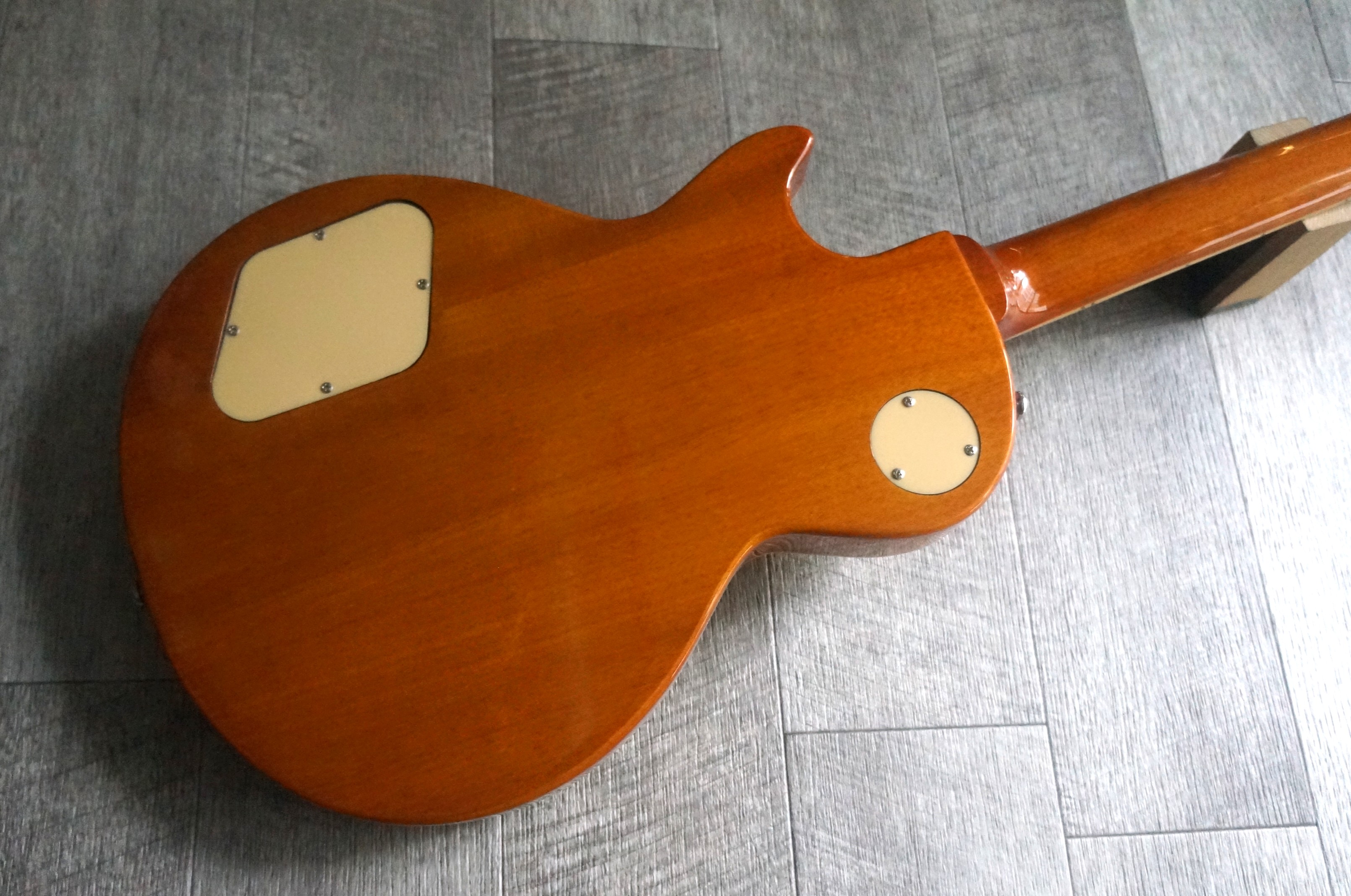トップにフレイムメイプル材を使用し、バックにオクメ材を使用したゴールドトップのレスポールスタンダードタイプ。