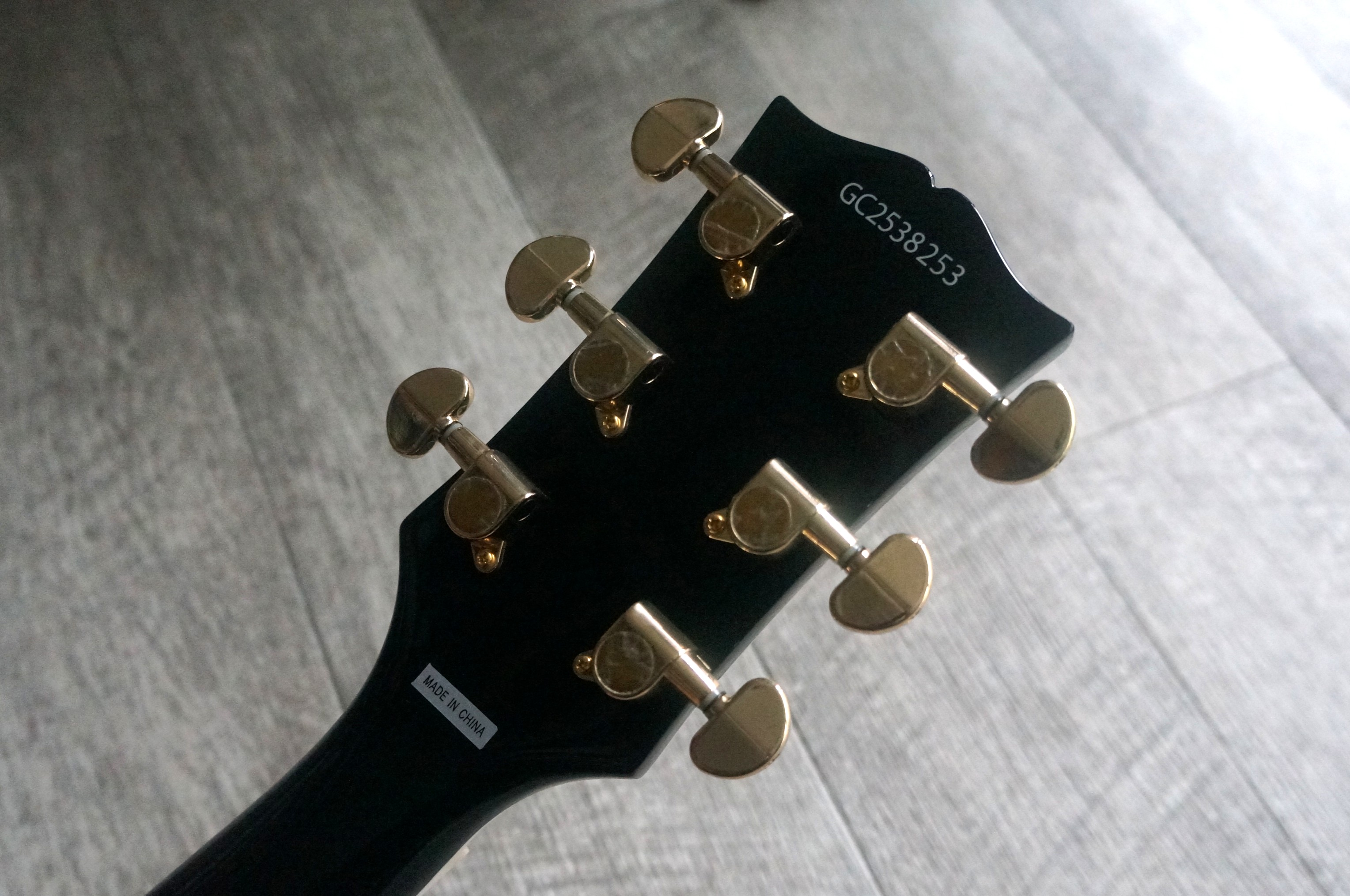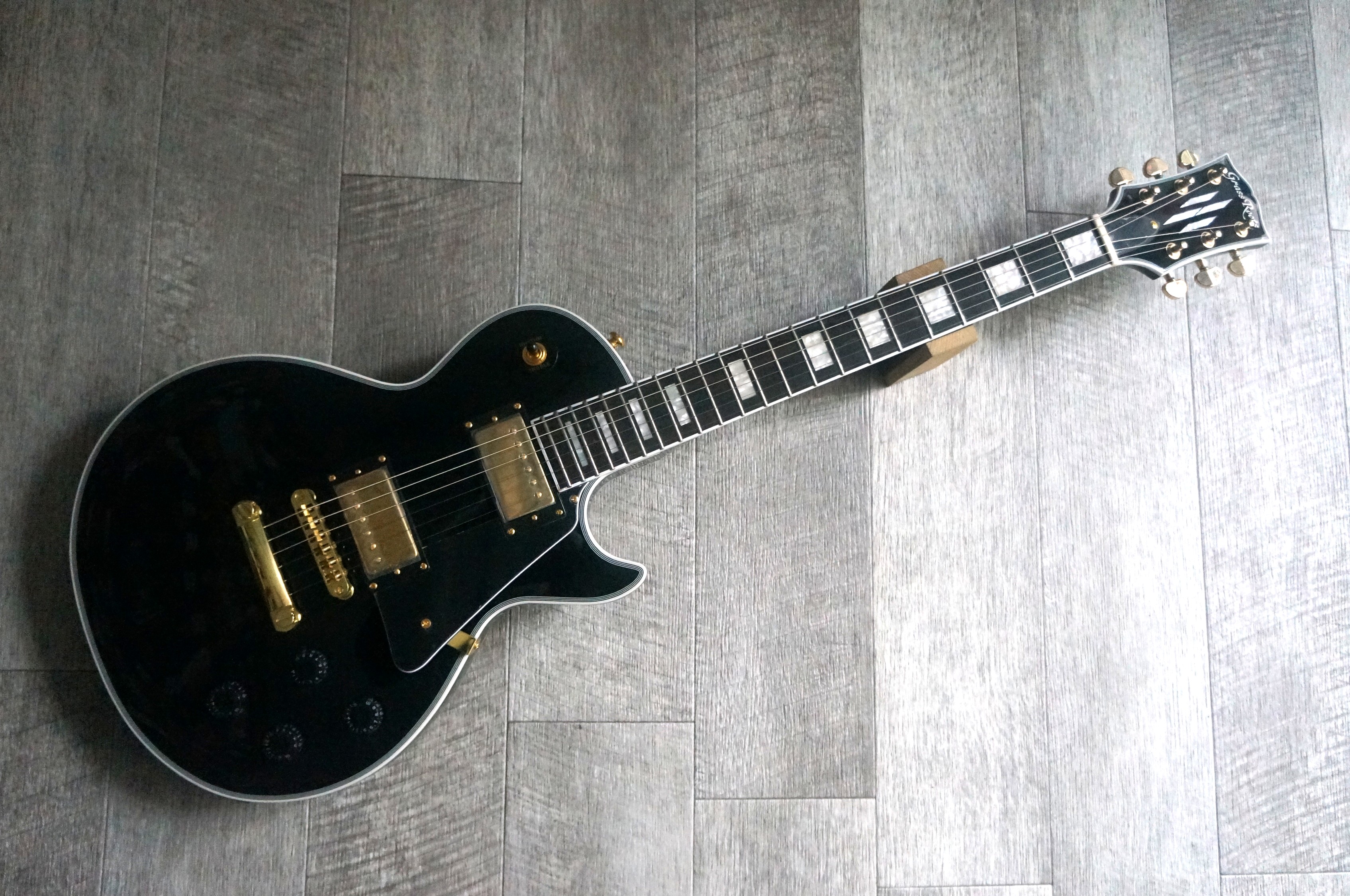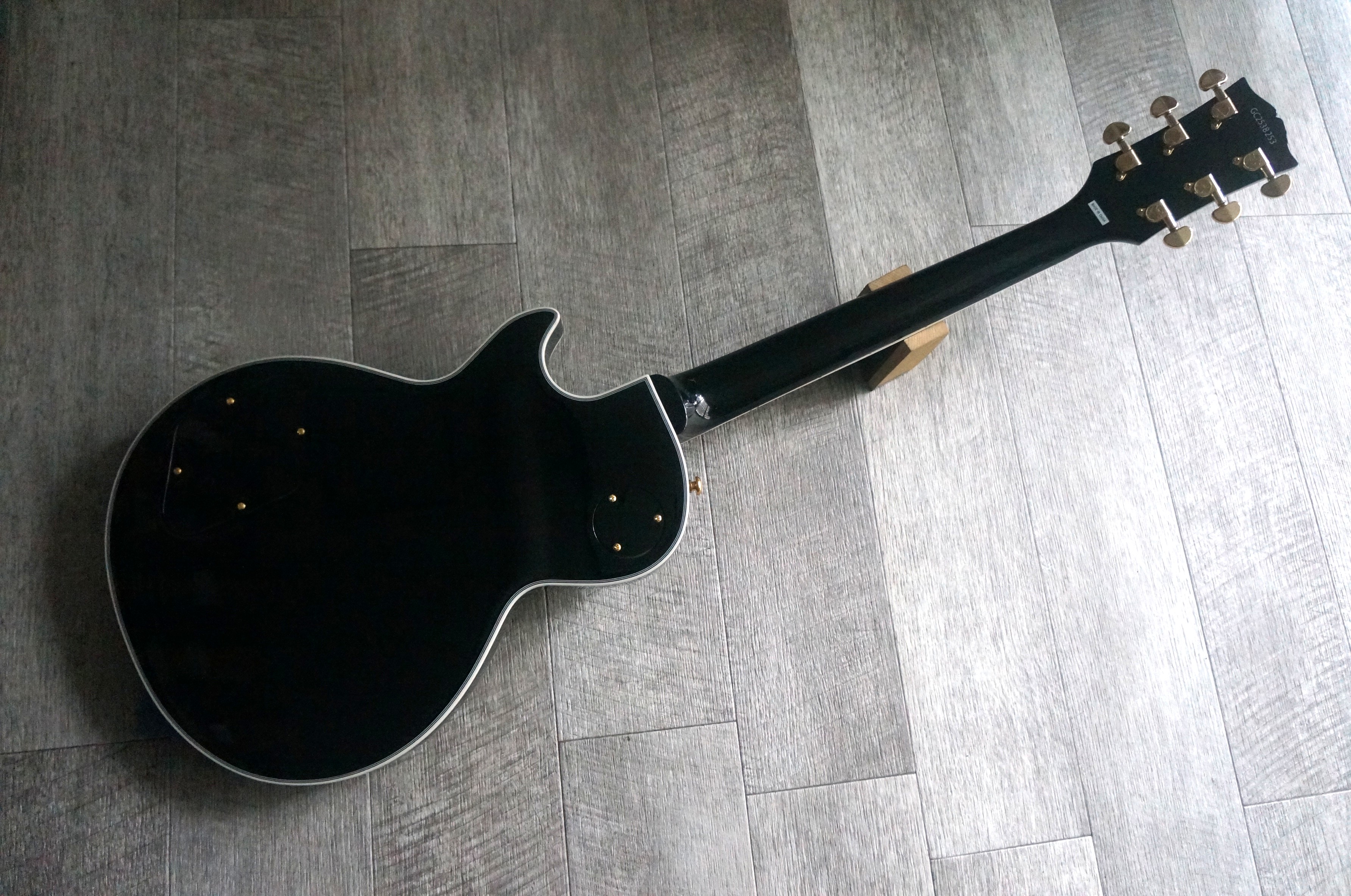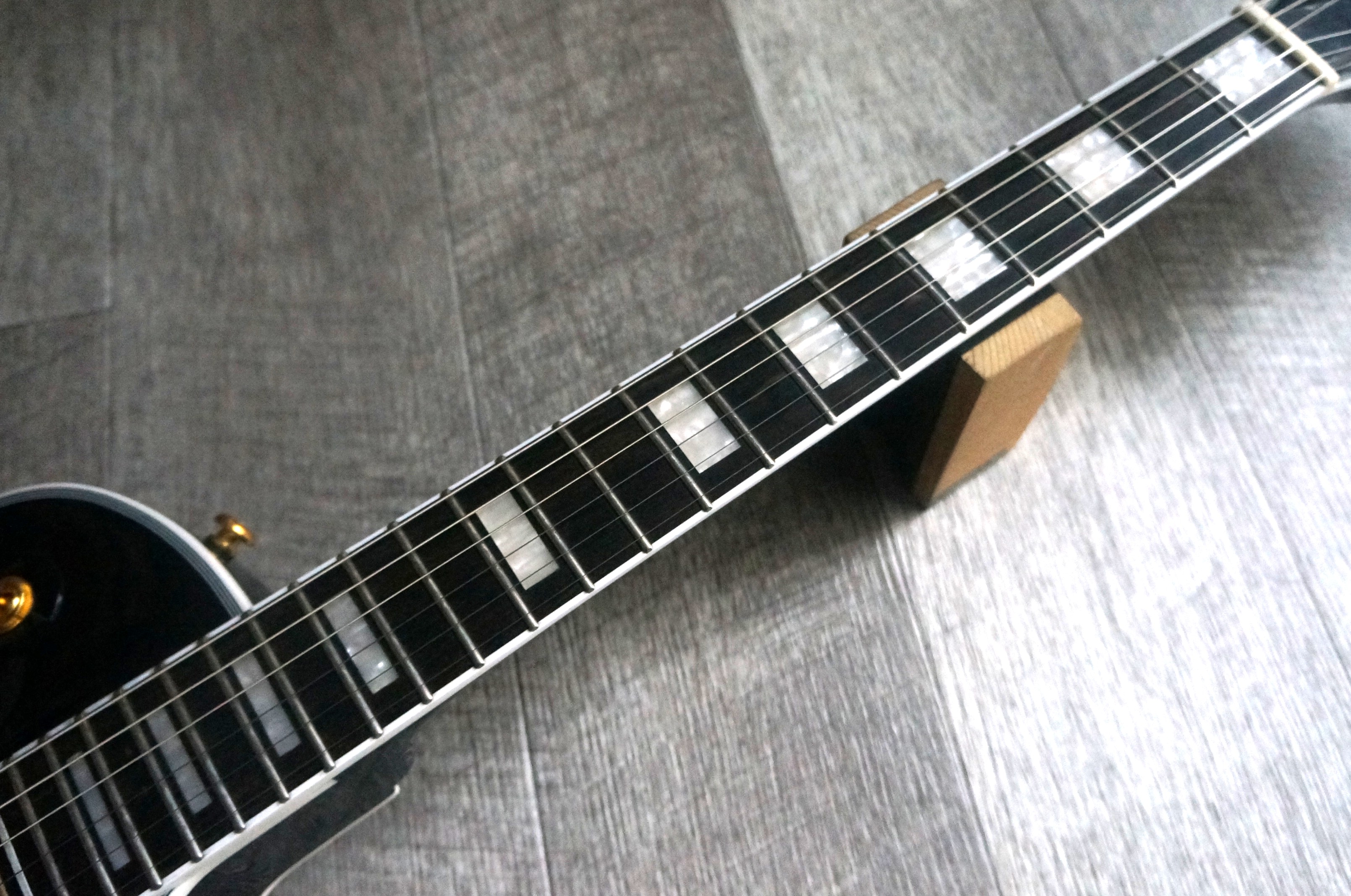 トップにハードメイプル材を使用し、バックにオクメ材を使用した黒のレスポールカスタムタイプ。