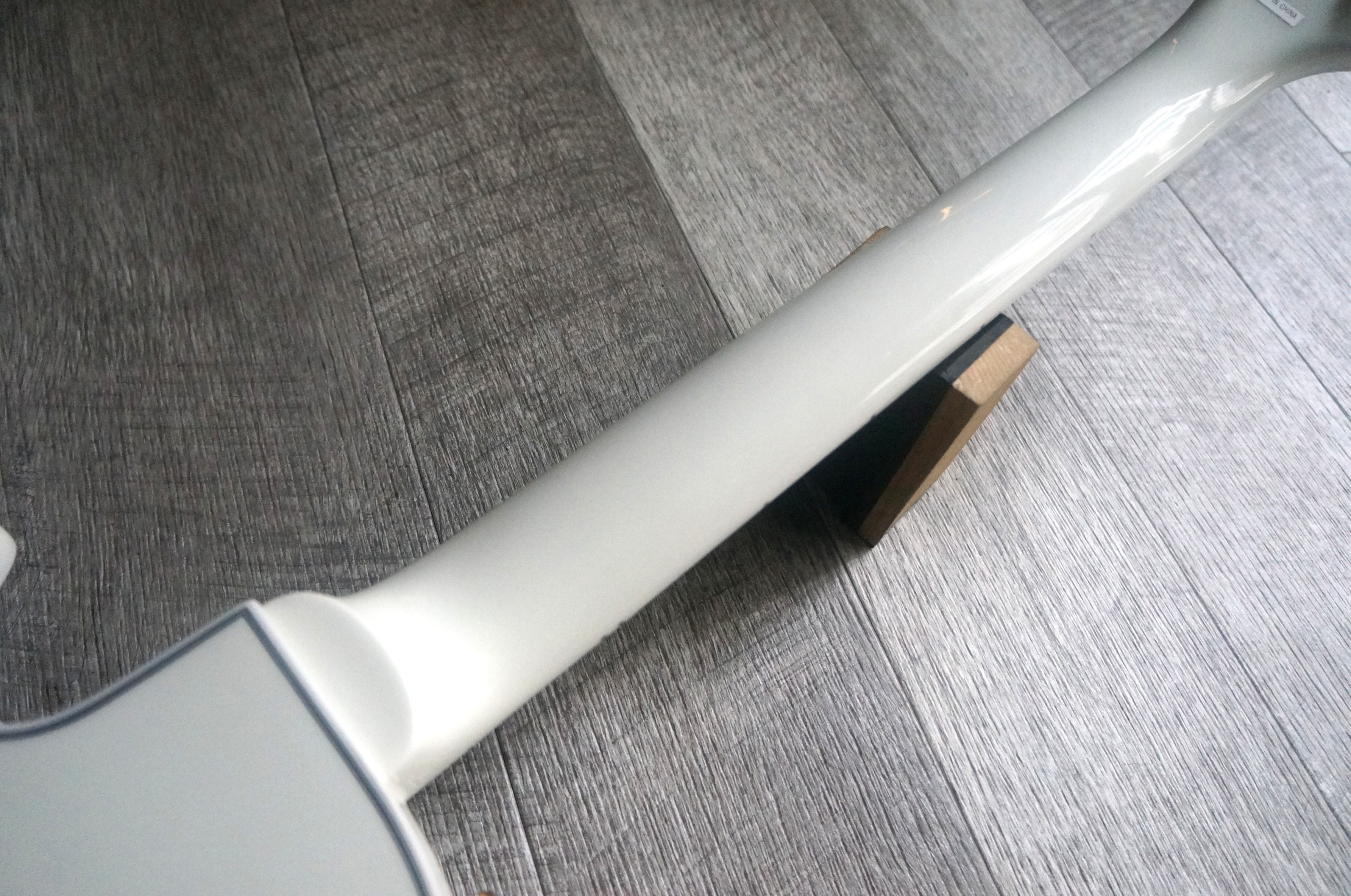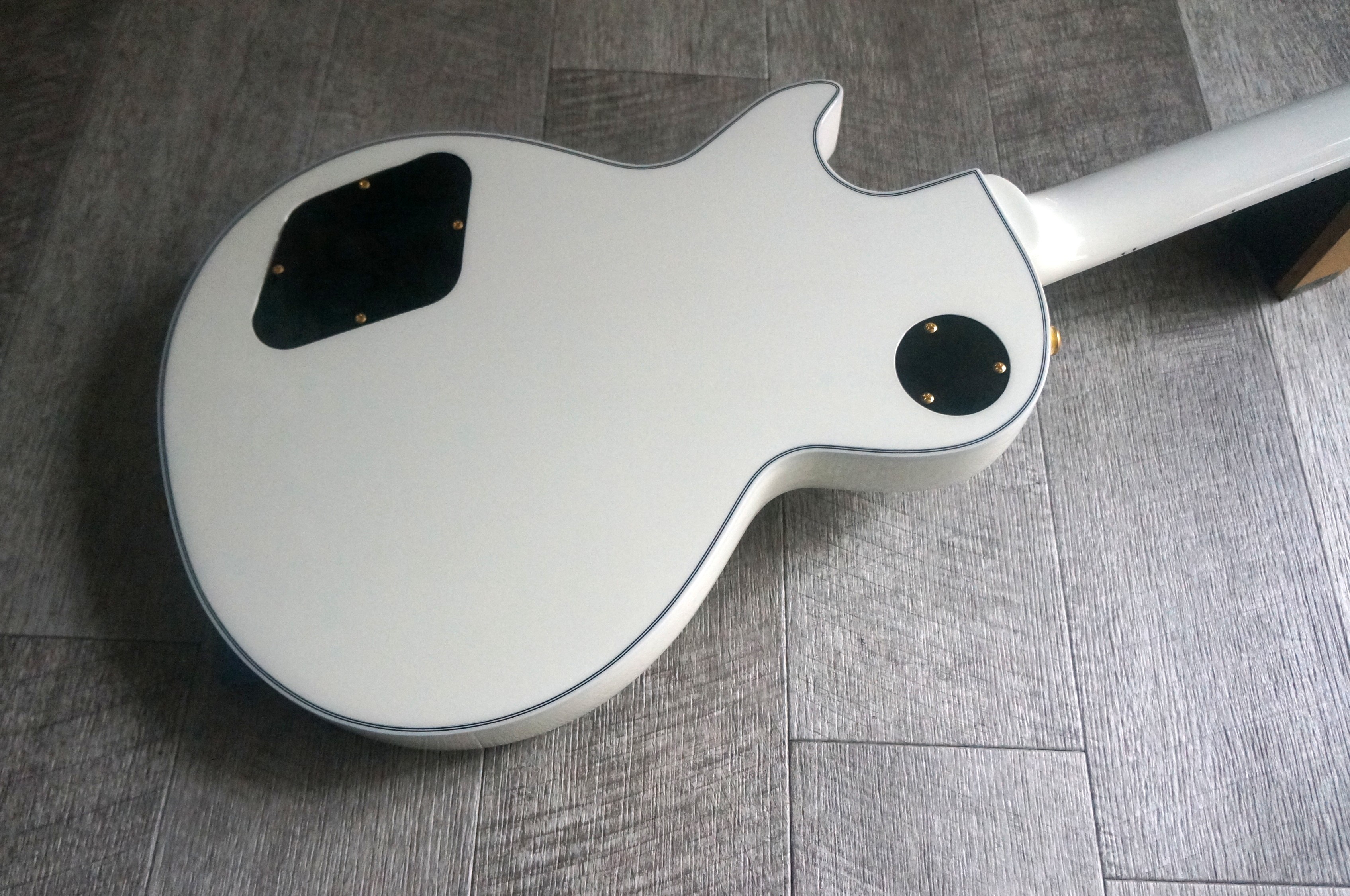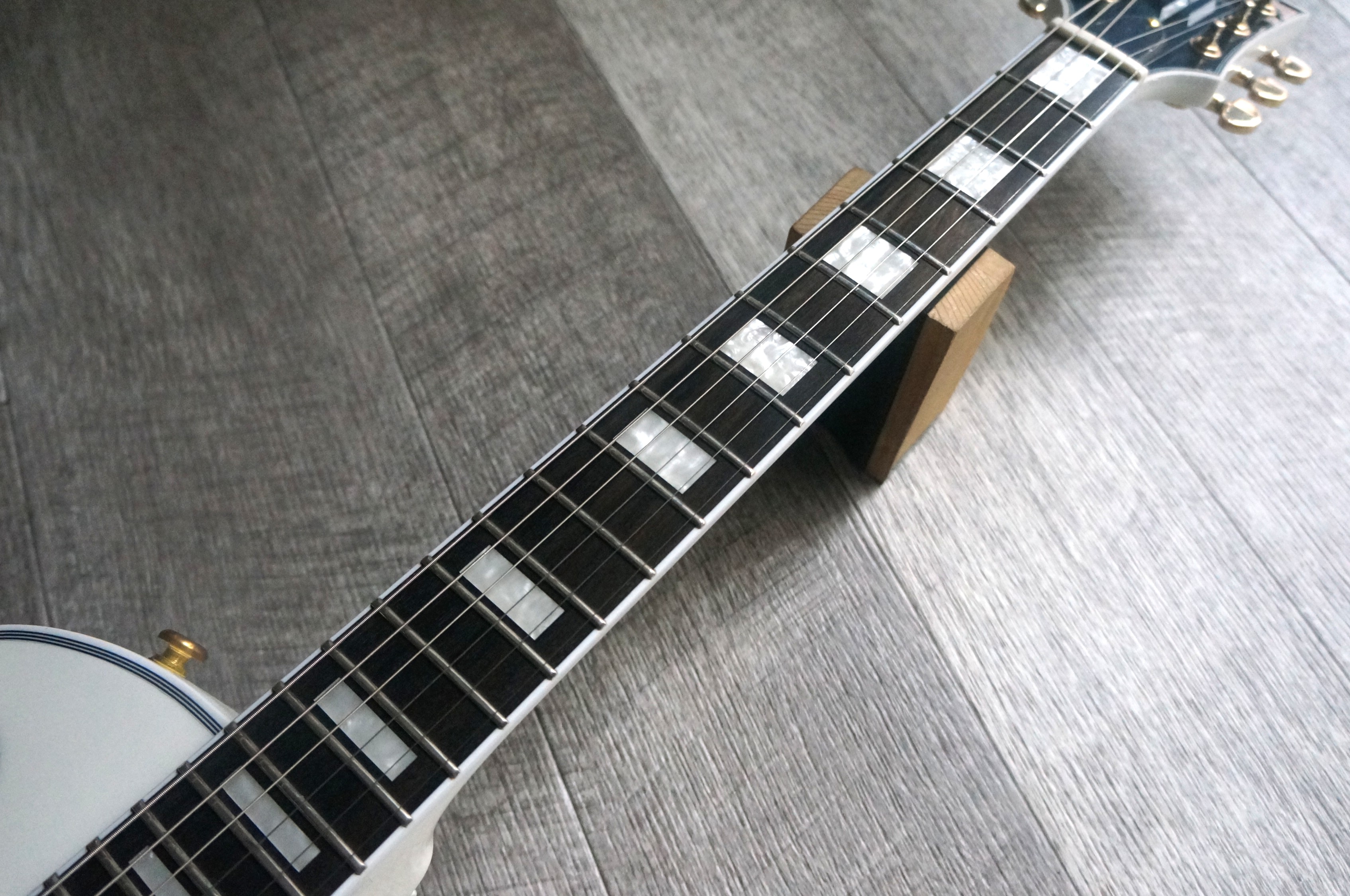 トップにハードメイプル材を使用し、バックにオクメ材を使用した白のレスポールカスタムタイプ。