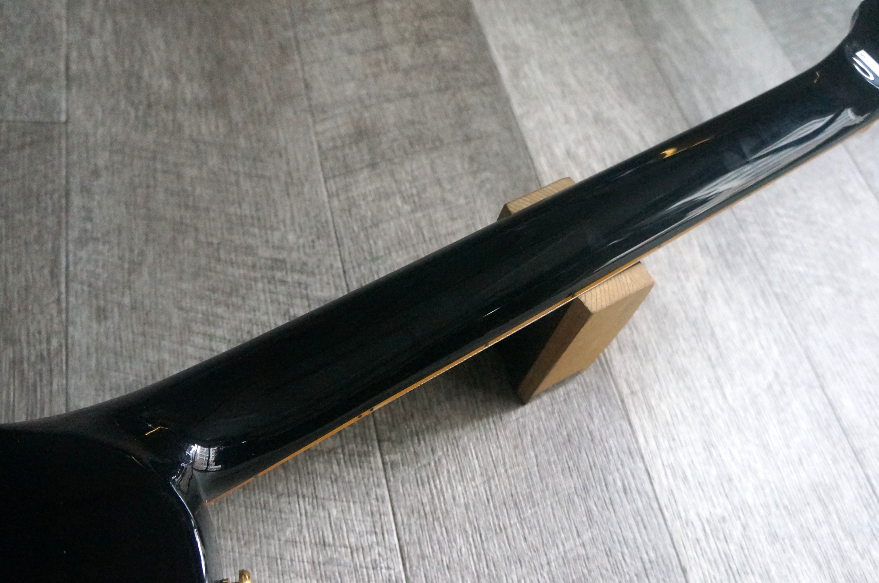 ボディは、オクメ材バック、ハードメイプルトップのラミネートボディで、ボディの厚さは最厚部で50mm、最薄部で40mmとなっています。また、ボディバックには体に当たる部分にウエストカット加工されています。