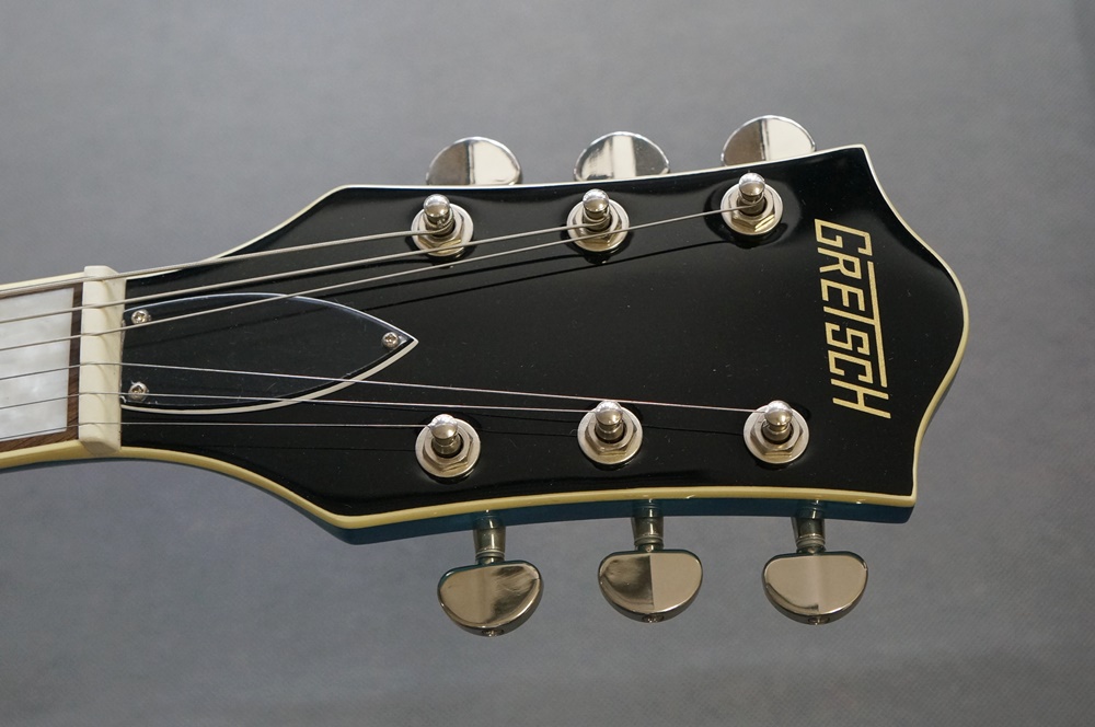 また、パーロイドの大きなブロック・ポジションマーカーがインレイされたローレル・フィンガーボードにナトー・ネックを組み合わせ、ゴールドのグレッチ・ロゴを配したブラッ・カラーのヘッドストック仕様となっています。