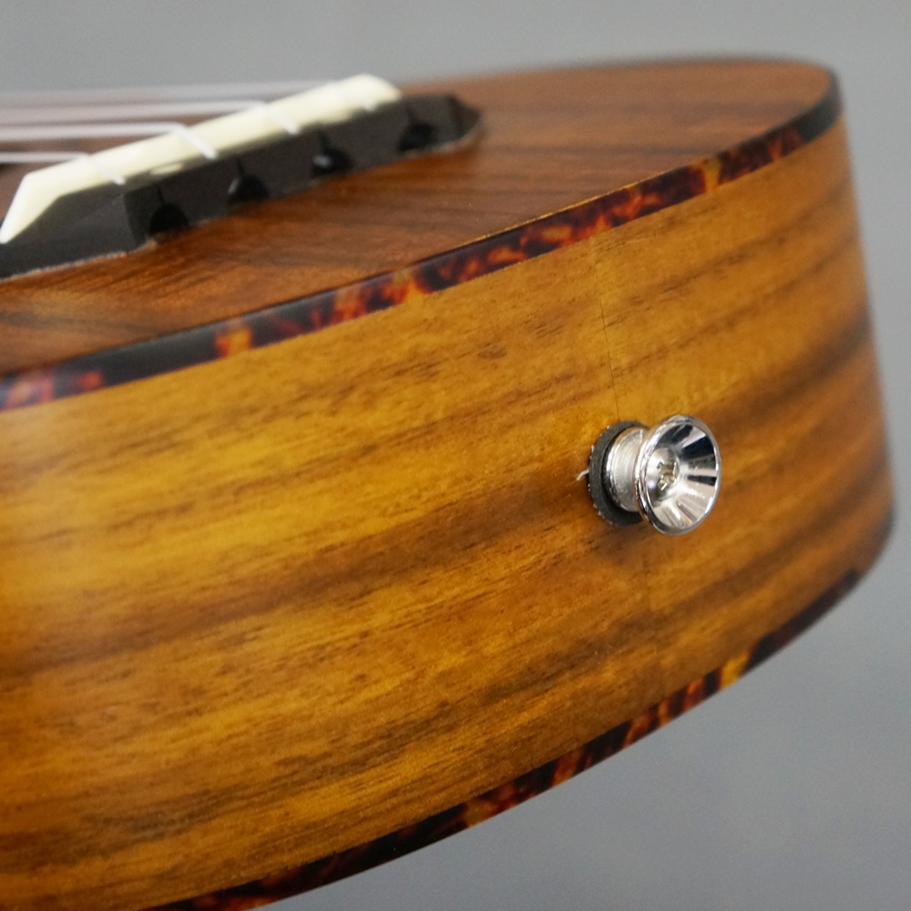 はじめからストラップピンがボディエンドに付いているため、ギター用ストラップやウクレレ用ストラップが簡単に付けられるのも嬉しい点です。