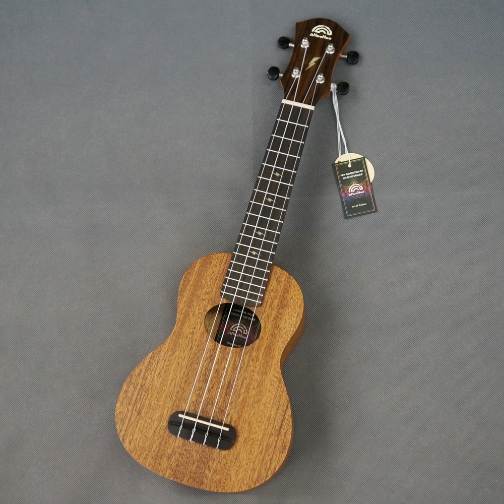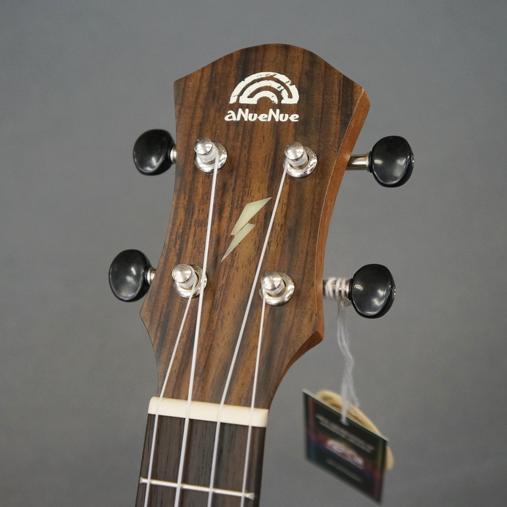 ボディトップ材にソリッドマホガニーを使い、抜けの有る、まろやかで暖かさの有るウッディなサウンドが特徴的です。ヘッドプレート・フィンガーボードにLumi Nova素材の輝く稲妻インレイデザインはaNueNueの遊び心を感じさせます。チューニングの安定したギヤペグに、弦振動をロスすることなく伝える形状のローズウッドブリッジ、ナット・サドルにはクリアなサウンドを生み出すSynthetic Boneを採用。aNueNue Rainbowロゴのデザインされたギグバックが付属します。