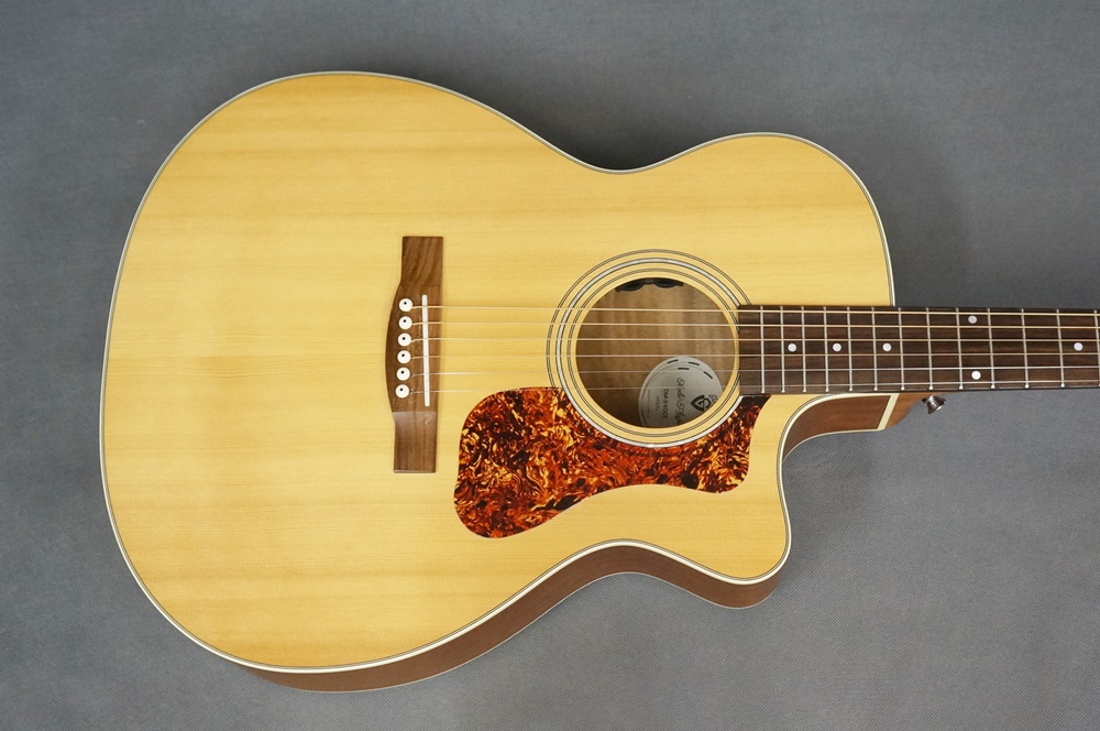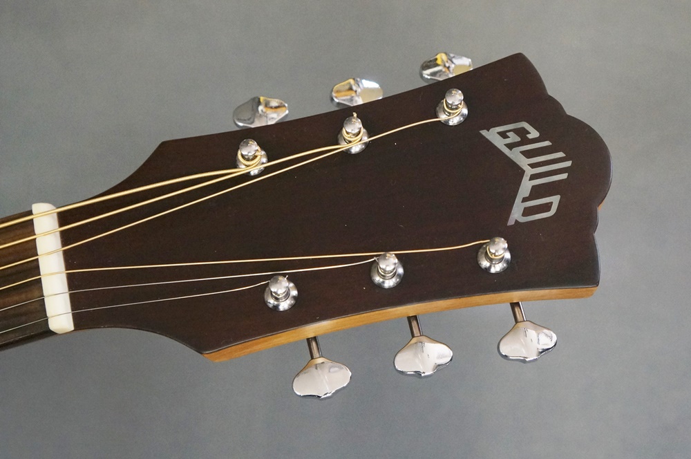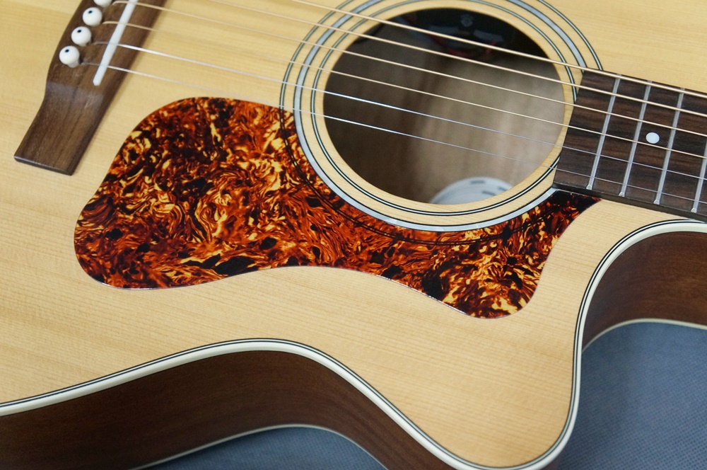 トップに単板シトカスプルース、サイドとバックはマホガニー材のラウンドバックで仕上げ、スキャロップドXブレイシングによるGuildらしい力強さを再現致しました。