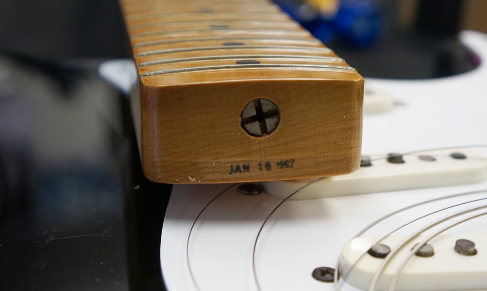 アルダーボディ。8点止めの1plyピックガード。ソフトVによるメイプルネックなど、1957年のストラトキャスターを再現したモデルです。